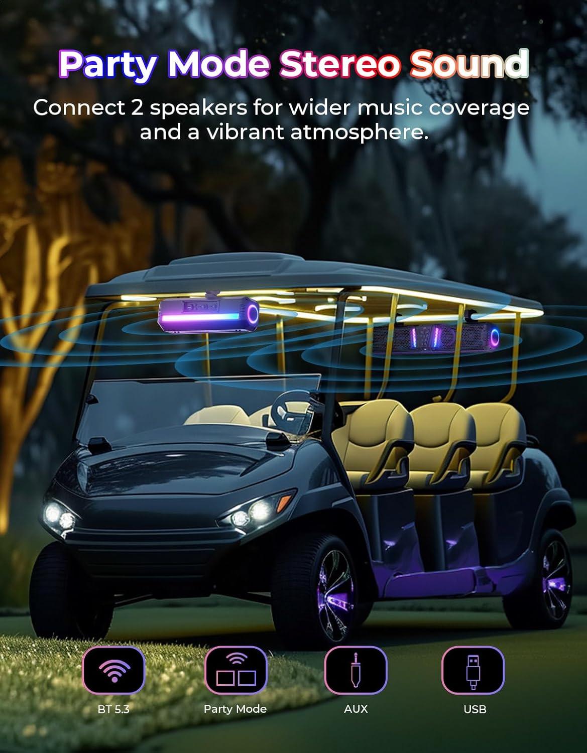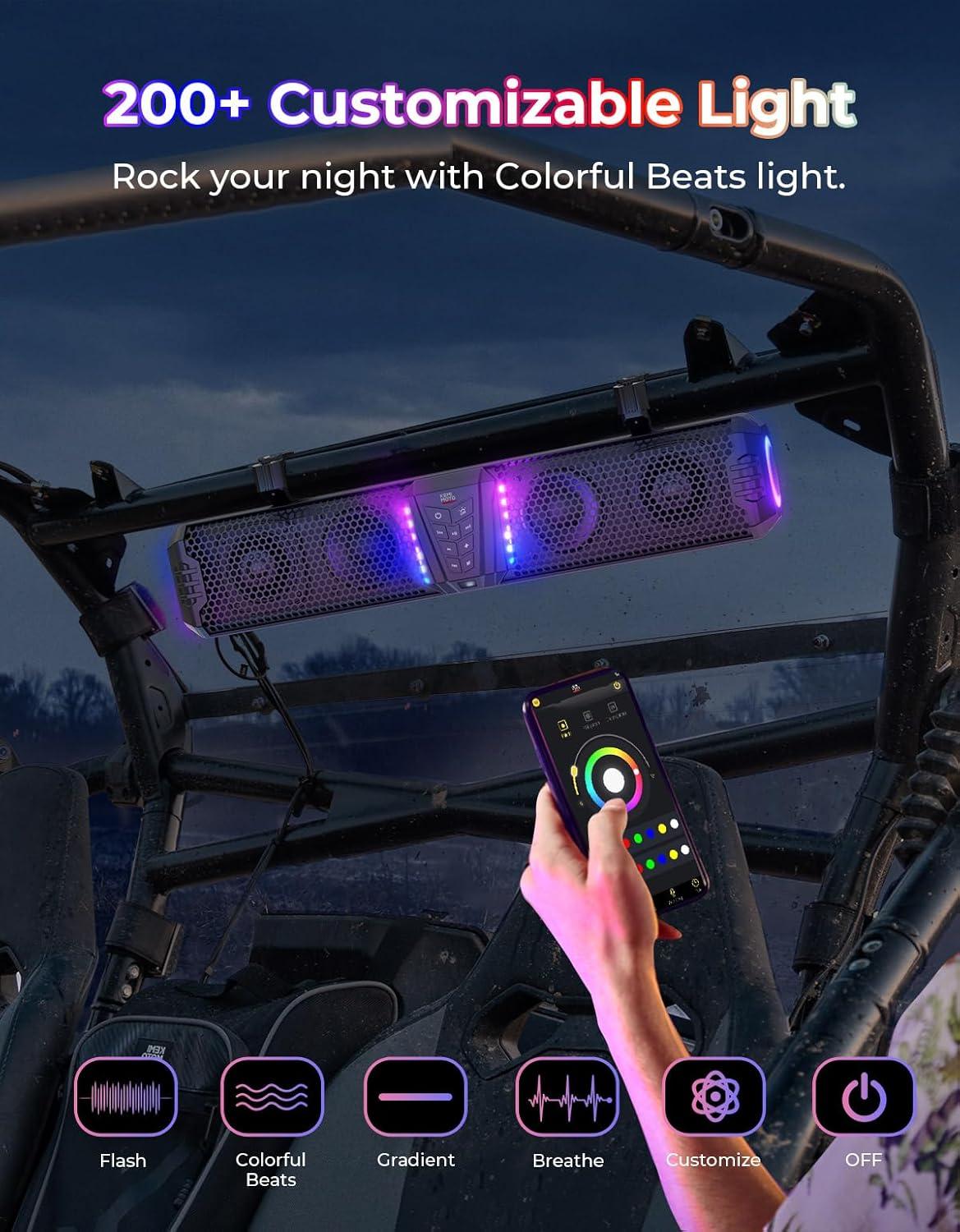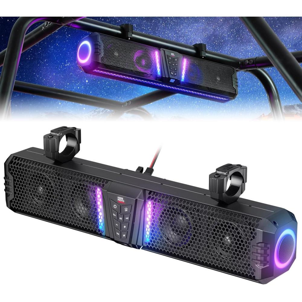 Fancier: Featuring a 5-side ambient ARGB light with more than 200 lighting modes via the app, the UTV soundbar creates a fancier, more dynamic, and customizable ambiance for outdoor rides and parties. 2 KEMIMOTO Midnight speakers can be connected for stereo sound in KEMIMOTO Party Mode. In KEMIMOTO Dome Mode, you can turn on the all-white reading light to read maps or manuals, a good companion for night riding