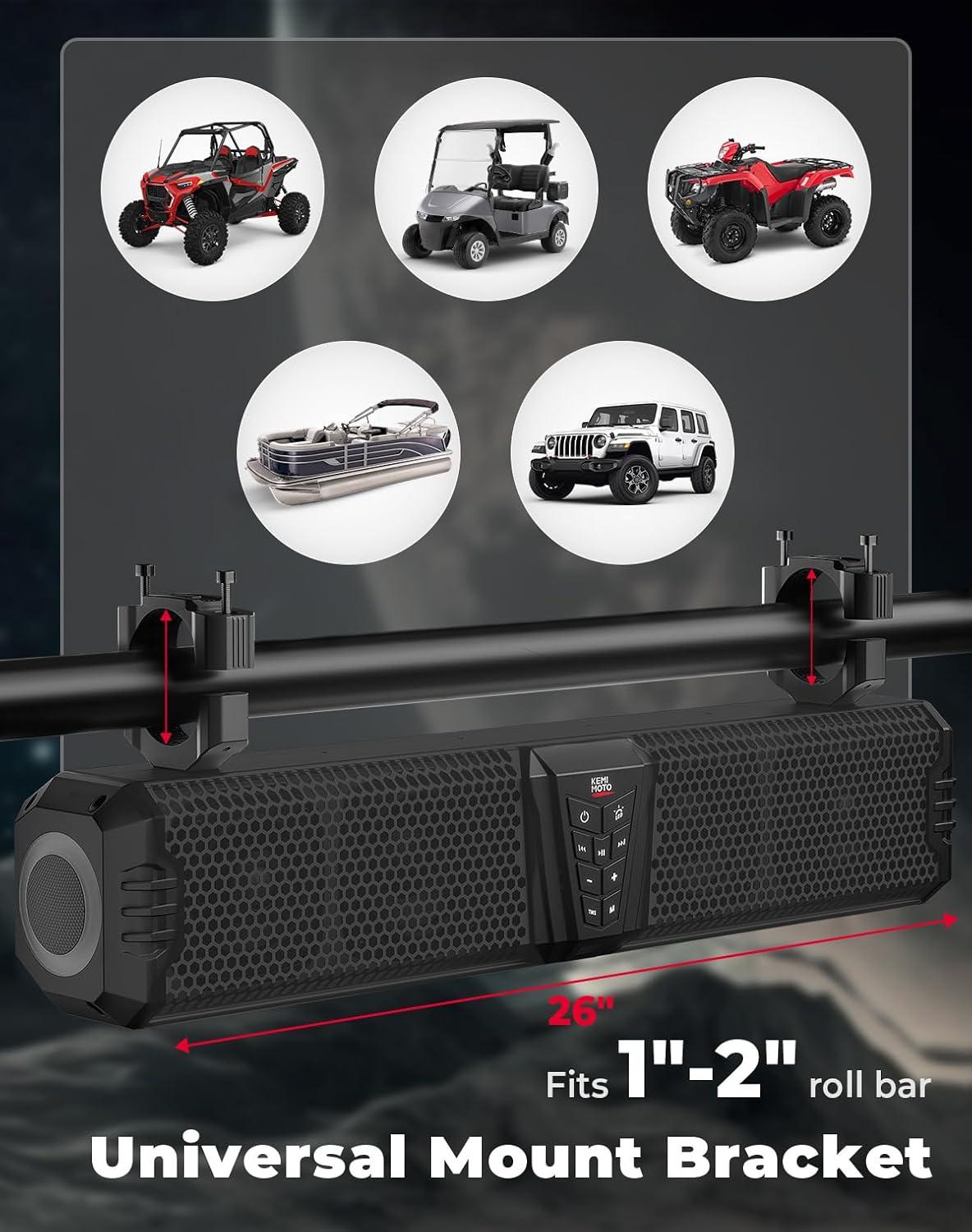 Easier: Designed for easier life on the go, the KEMIMOTO Soundbar can be installed without drilling, allowing you to enjoy your favorite tunes in just 20 minutes, saving you time. With dimensions of L16″ x W4.6″ x H5.0″ and compatibility with 1 inch to 2 inches roll cages, the speaker bar can be mounted on UTVs, golf carts, ATVs, or marine boats. Installation videos are available to help you install it with ease