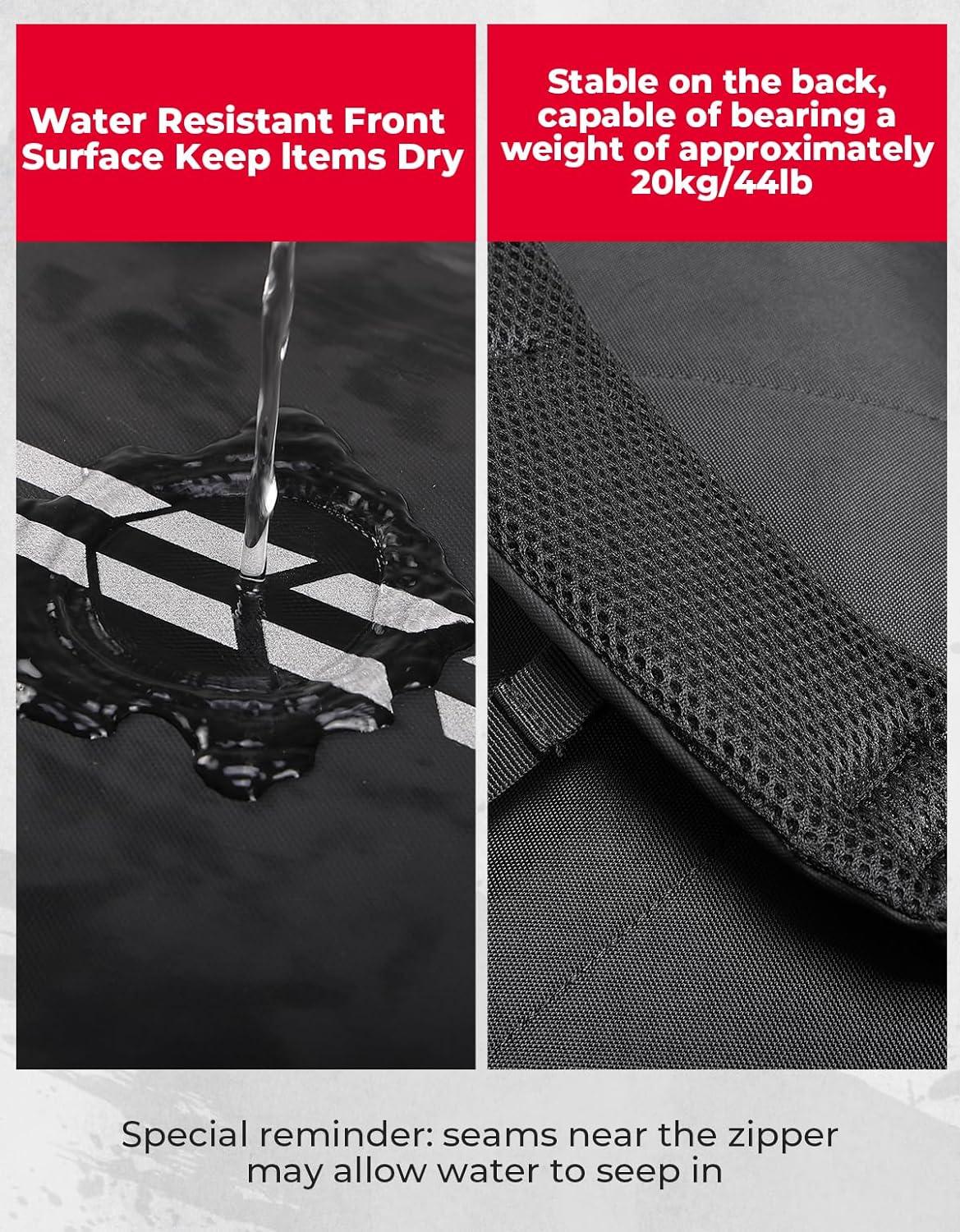 【Water-resistant Design】This motorcycle helmet backpack is made of PVC film material with water-resistant fabric. It is important to note that the seams of the zipper are not water-resistant. The back is designed with Oxford cloth and cotton to ensure comfort.
