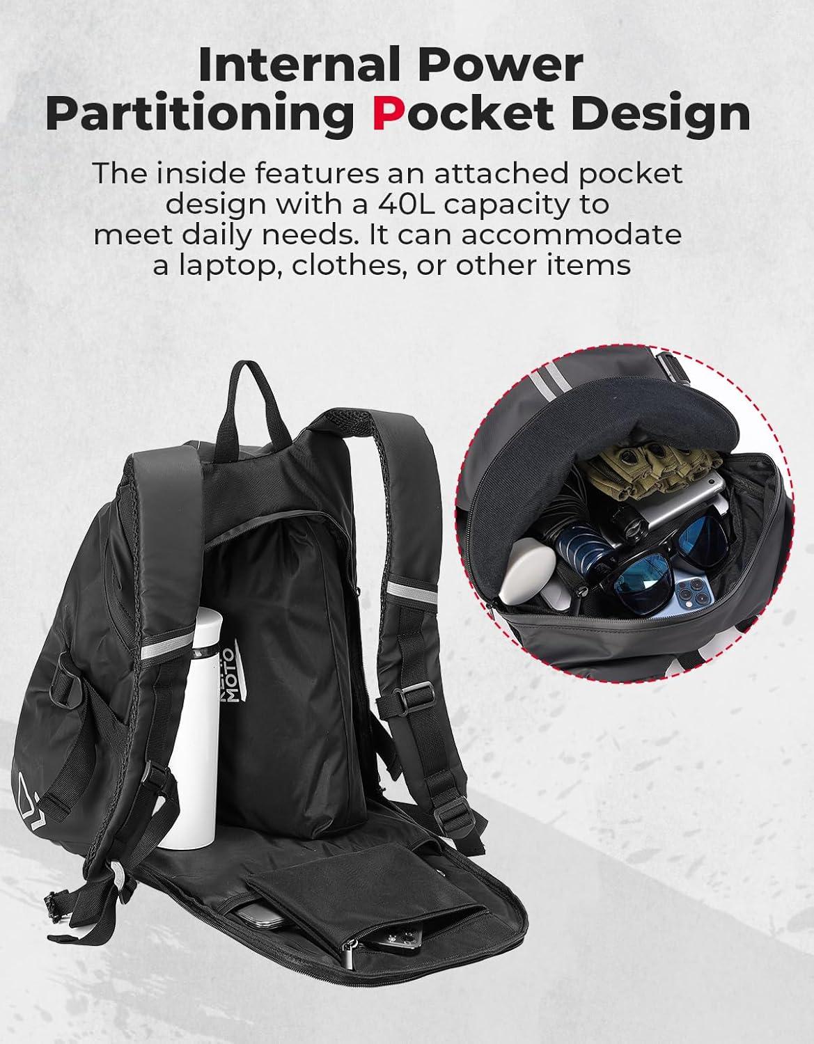 【Better Load-Bearing Capacity】This motorcycle helmet backpack features a 40L large storage space, upgraded ergonomic shoulder straps, designed to be tear-resistant, durable, and with enhanced weight-bearing capacity.