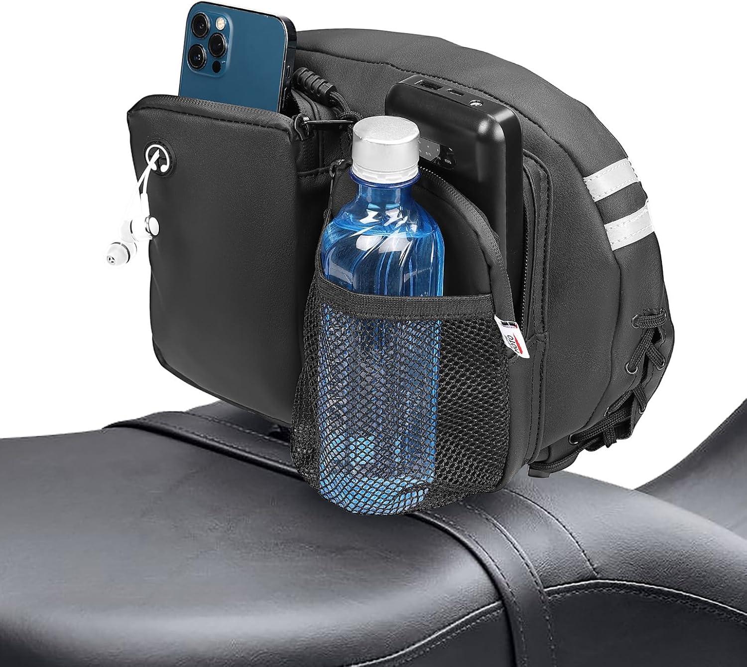 Provide Additional Storage: The KEMIMOTO rider backrest organizer bag is equipped with 2 waterproof zippered pockets and 1 mesh pocket specifically designed for beverages. This convenient accessory provides a secure storage solution for your phone and cups while riding. Additionally, it features an extra headphone jack, enabling you to enjoy your favorite music during the journey without any worries of your phone slipping off