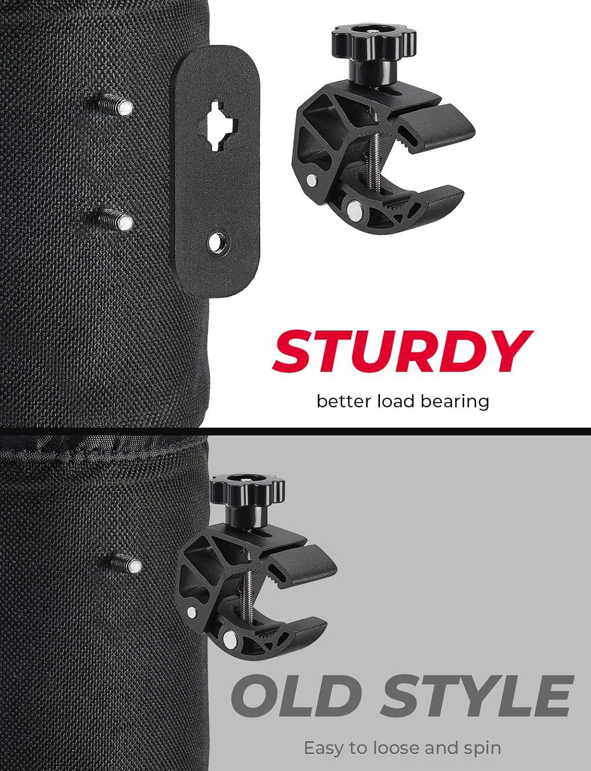 Upgraded Alligator Clamp-Patented Design: Compared with the old style, kemimoto motorcycle cup holder has upgraded the 90°adjustable alligator clamp increased from 1 screw to 2 screws, and add a cross-mounting hole design, which is more sturdy, better load-bearing, and will not loosen or spin. Get rid of the trouble of falling off and loosening when riding at high speed and spinning when holding large-capacity water bottles