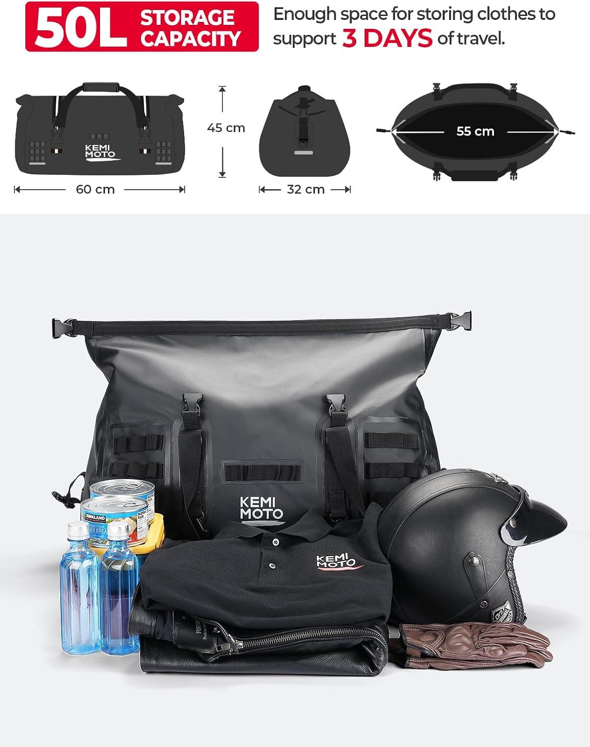 50L Large Capacity: Motorcycle luggage bag 50l can and hold all your camping gear, such as helmets, windproof jackets, gloves, etc. The pocket is rolled up and the two side locks are fastened to save space and release the back seat of your motorcycle