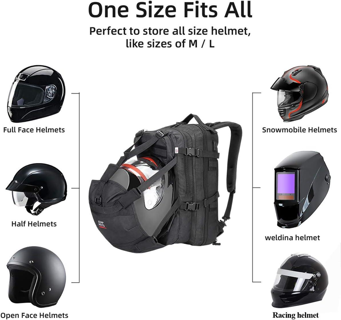 HELMET BACKPACK – This motorcycle helmet bag has a helmet compartment. Fits all kinds of helmet, basketball, 2L water bladder. The bag is not ideal for carrying clothing or anything that will create a “bulky” feeling. The backpack is ideal for simple errands and is an alternative for having to strap the helmet around your waist.