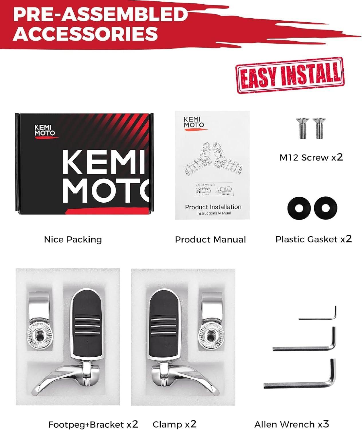 Adjustable Angles:KEMIMOTO Foot Peg mounting clamp is 360 degree adjustable, The ped 90 degrees Foldable.You can fold it up when you don't need it,and firmly grips the engine guard, and the locking design secures the peg at the desired angle. Skid proof engraved durable rubber surface