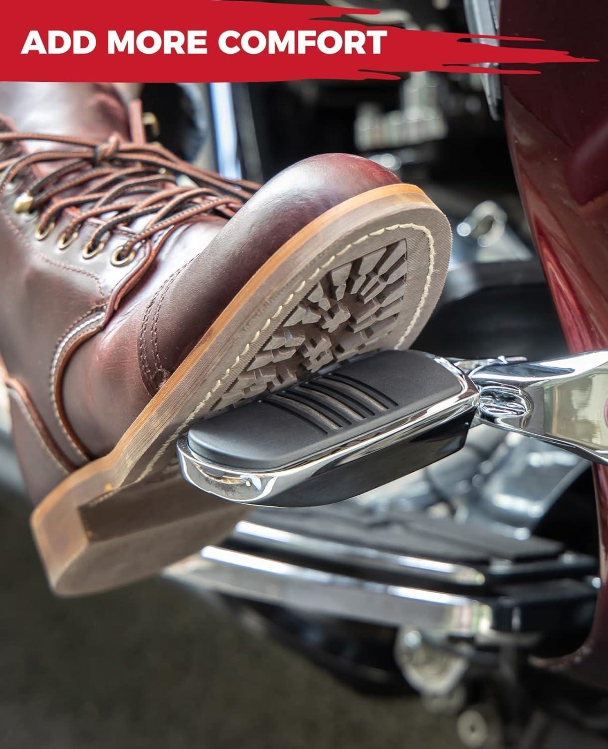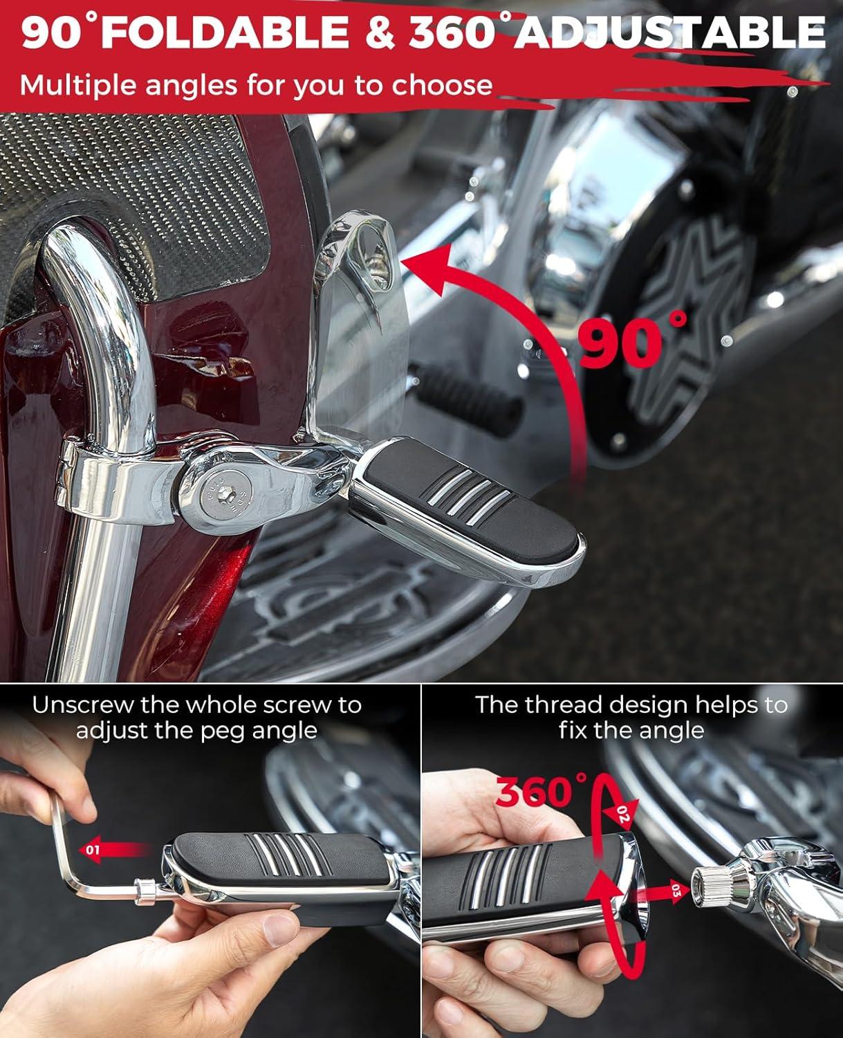 Adjustable Angles – Mounting clamp is 360 degree adjustable, and firmly grips the engine guard, and the locking design secures the peg at the desired angle. Skid proof engraved durable rubber surface.