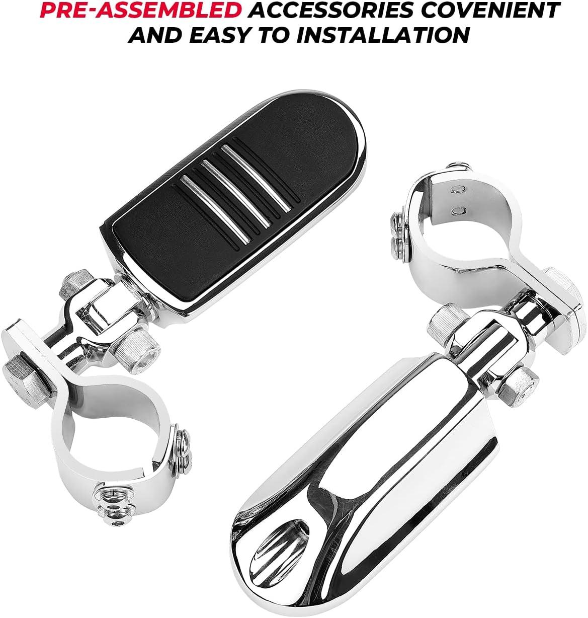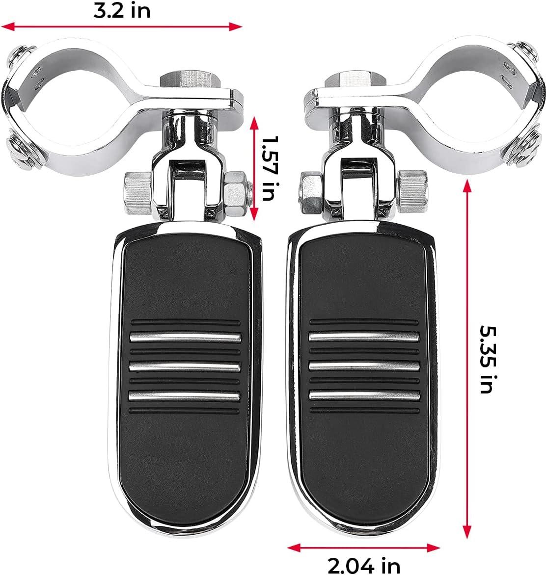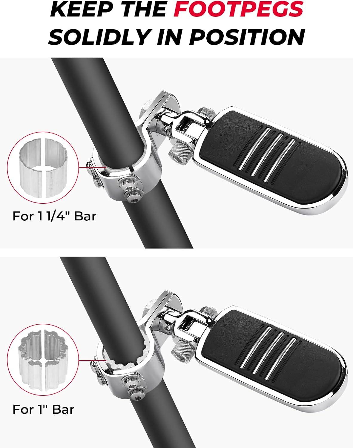 Fitment: The motorcycle highway pegs are universal fit for touring models: Softail, Dyna, Electra Glide, Road King, Roar Glide, CVO, Street Glide 1 1/4″(32mm) Engine Guard Bars; Universal fit for all motorcycles with mounting clamp inner diameter from 1″(25mm) to 1 1/4″ (32mm) 1 1/3″ (34mm) inch are suitable
