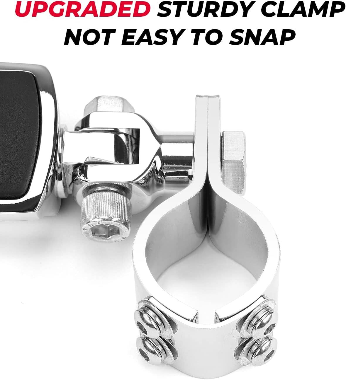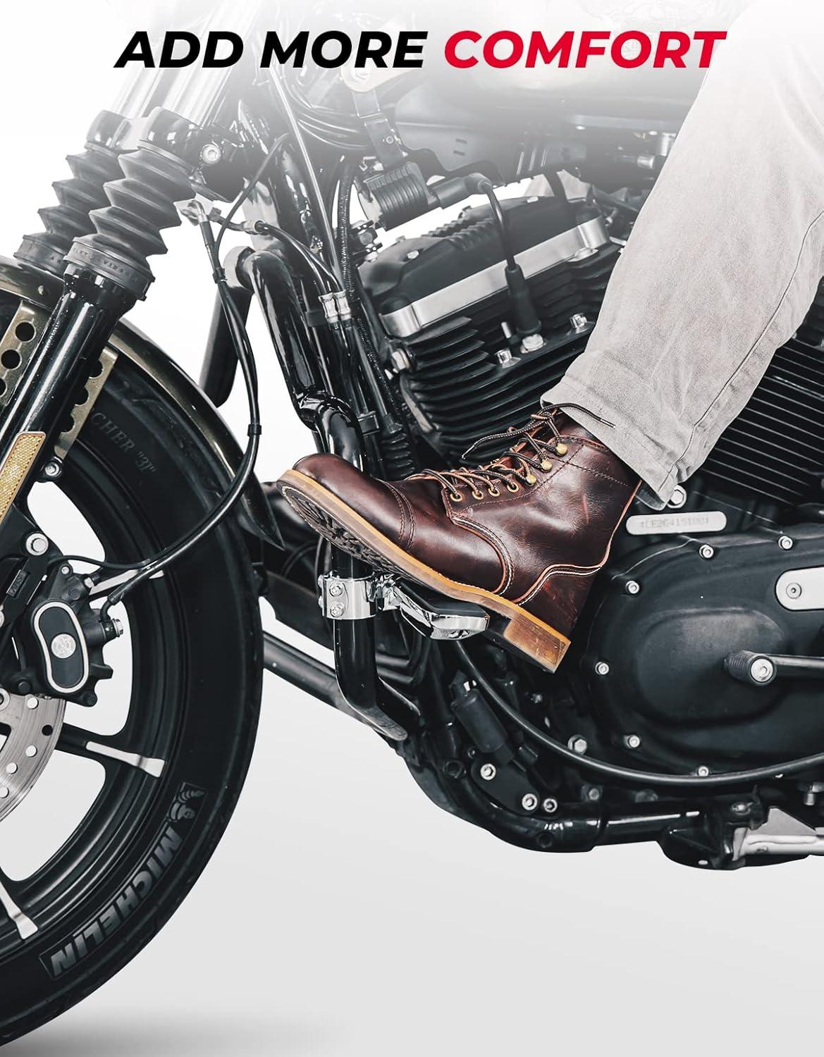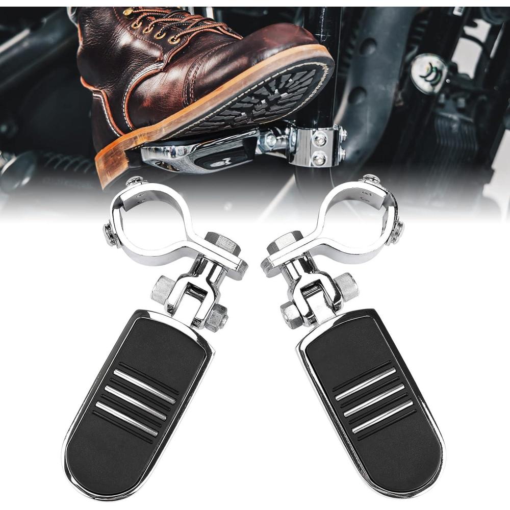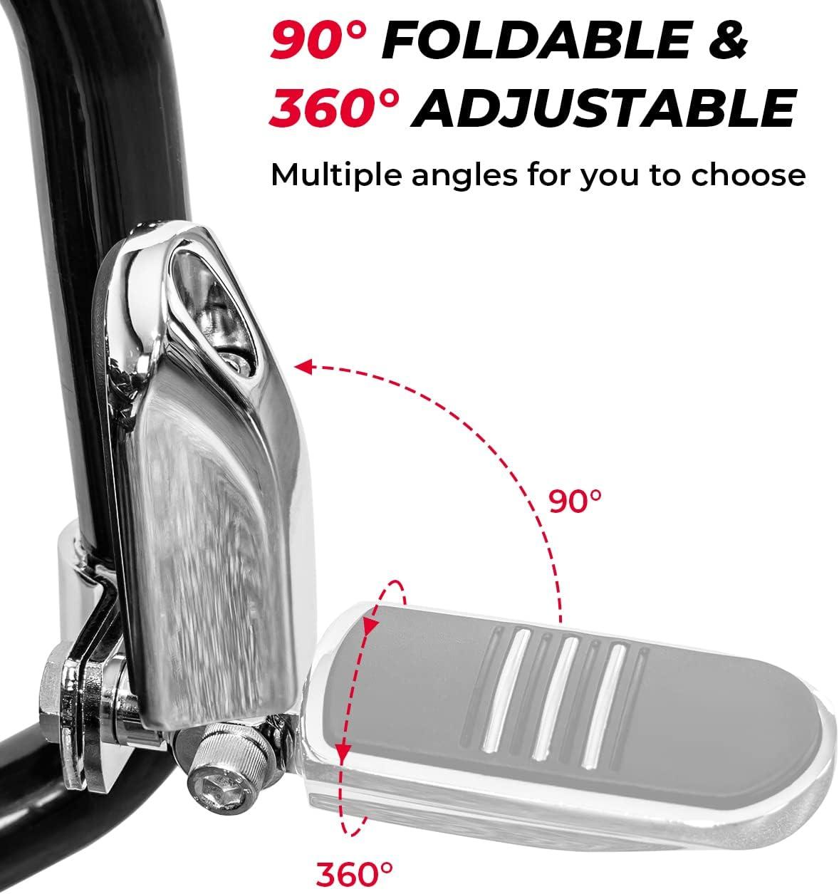 Foldable and Adjustable: The 360-degree adjustable clamps securely grip the engine guard, locking the highway pegs at the desired angle for comfort. They easily fold up when not in use. These motorcycle highway pegs help reduce fatigue and improve comfort on long rides, especially for riders with large feet