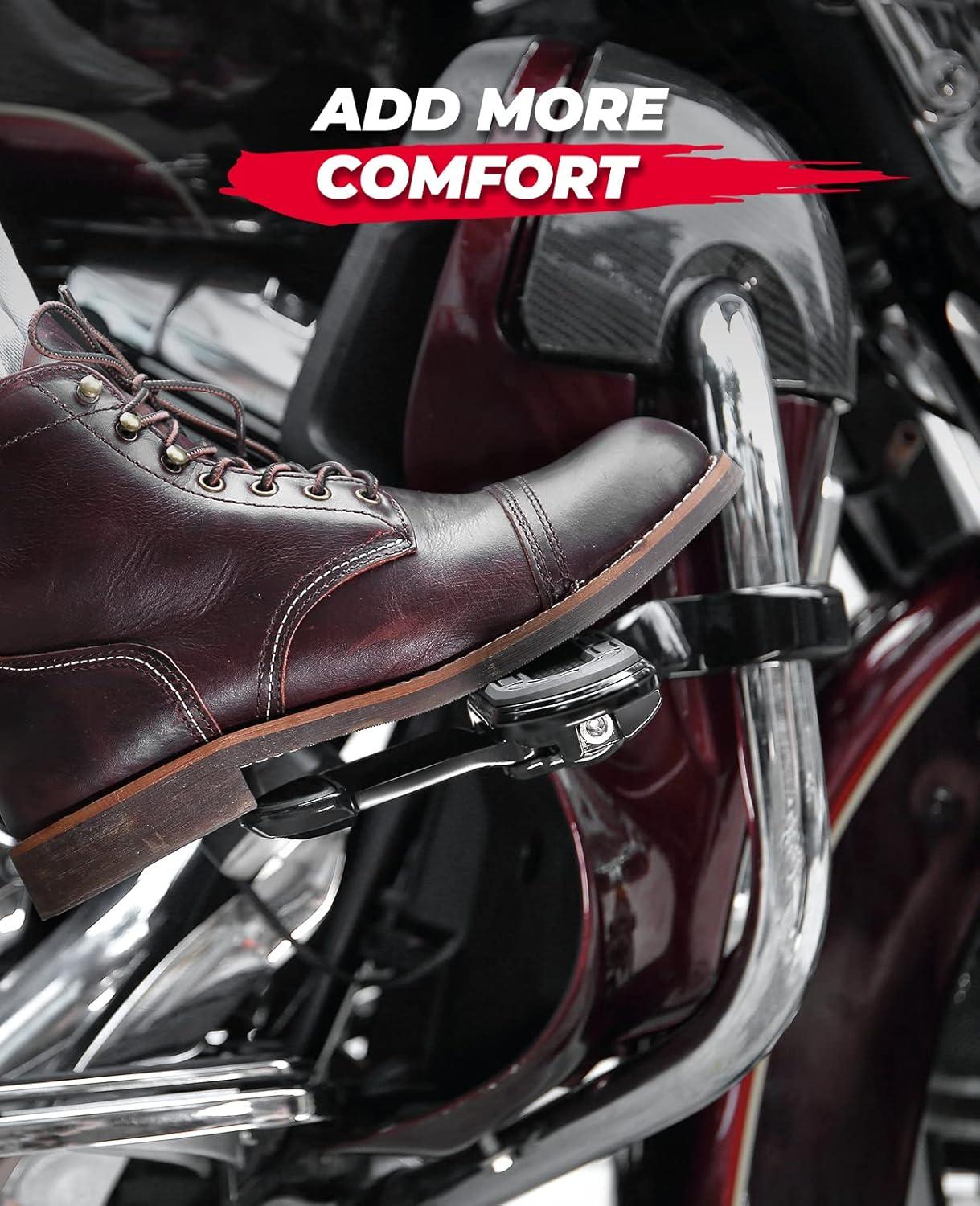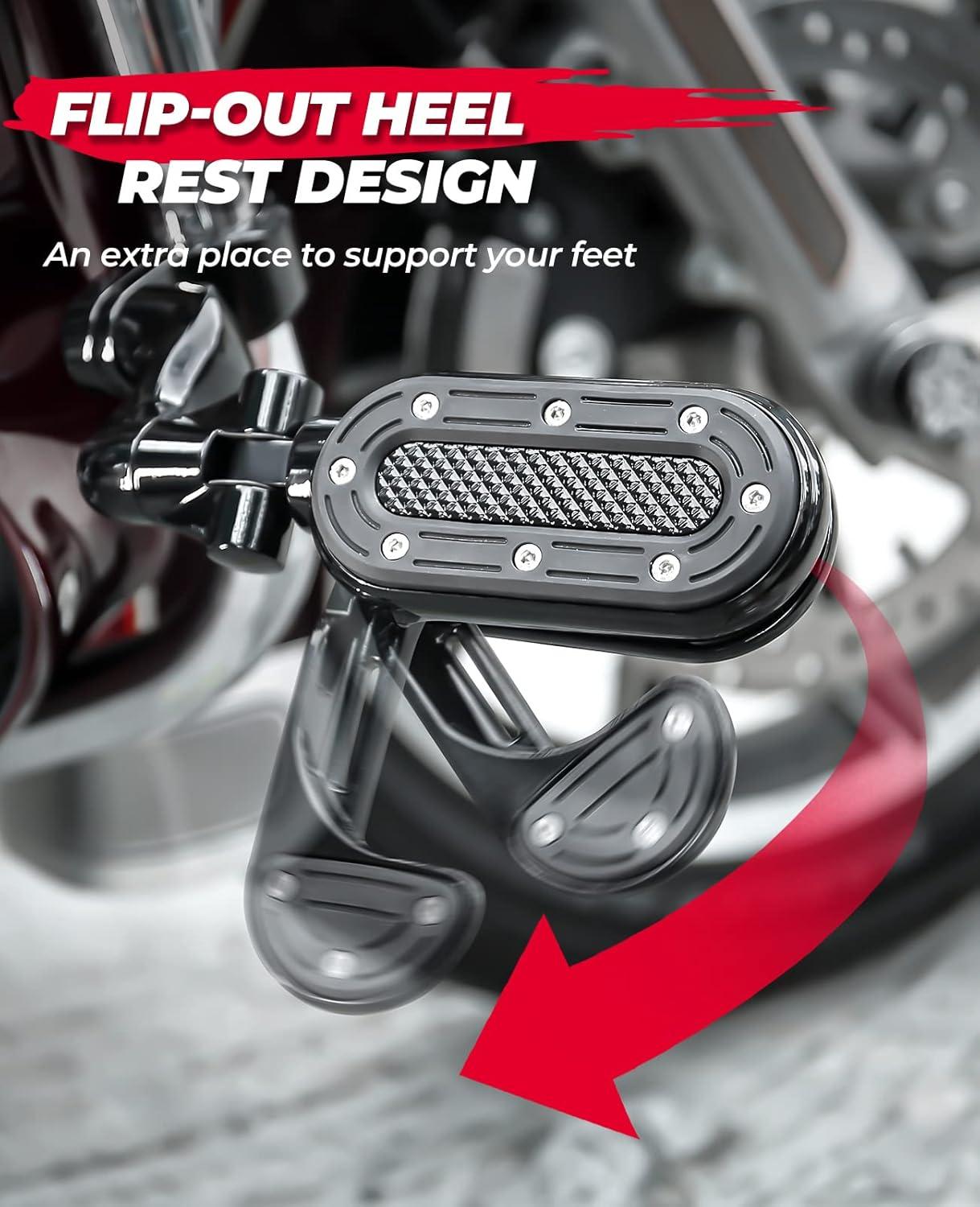 Comfort: Add a place to stretch your legs out and tilt your feet outward for added comfort. Flip-out Heel Rests of the highway foot pegs can take your comfort to the next level during a long ride