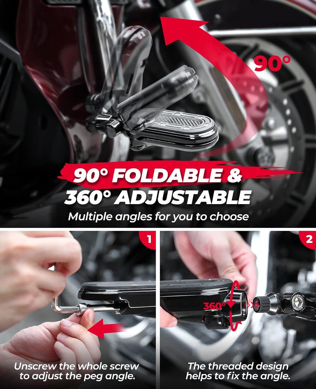 Adjustability: Highway pegs can be adjusted 360° to desired angles under the assembly and rotation of several small parts, 270° Adjustable allows to up or down adjustment,90° foldable allows to retract the footpeg.Sutiable for both short and tall riders