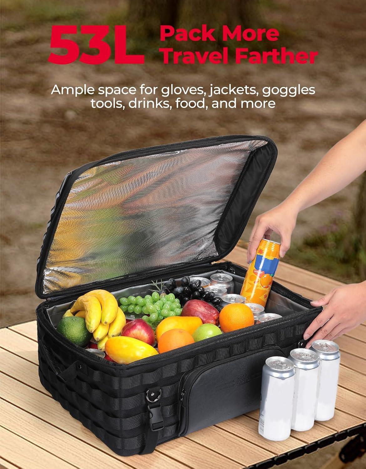 Cooler Bag Function: The luggage trunk bag features a cooler compartment, perfect for travel storage and instant cooling. Secured with hook-and-loop tape, it fits drinks, fruits, and foods for daily travel. Use ice packs and keep contents below half the bag's height. Note: Do not use loose ice to prevent water leakage.