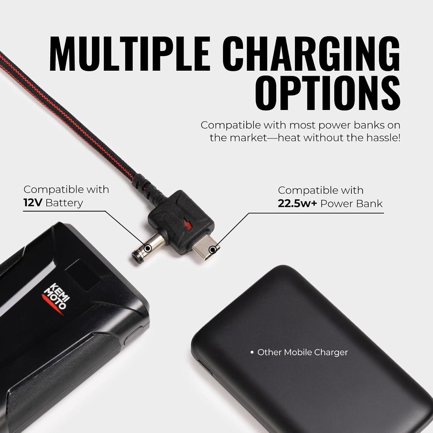 【Long Battery Life】:The heated motorcycle jacket is equipped with a 20,000mAh battery, operating continuously for 10-15 hours on the low setting, 7-8 hours on the medium setting, and 5-6 hours on the high setting. Additionally, the riding heated jacket supports two charging methods: one compatible with power banks of 22.5W or higher, and another compatible with 12V batteries, providing excellent versatility