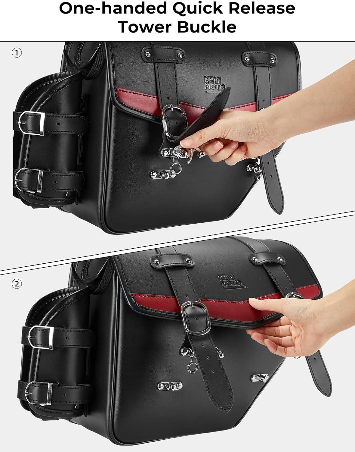 Stays in place and waterproof: The motorcycle saddle bag's surface is crafted from premium artificial leather, ensuring exceptional water resistance. Not only are they waterproof, but they also remain dry even during light rainfall. Reinforced with EVA material internally, these bags maintain their shape effortlessly, even when empty. The enhanced scooter saddle bags are remarkably robust, eliminating concerns of sagging or detachment. Additionally, we've incorporated a stylish touch of red stitching, greatly adored by numerous female riders