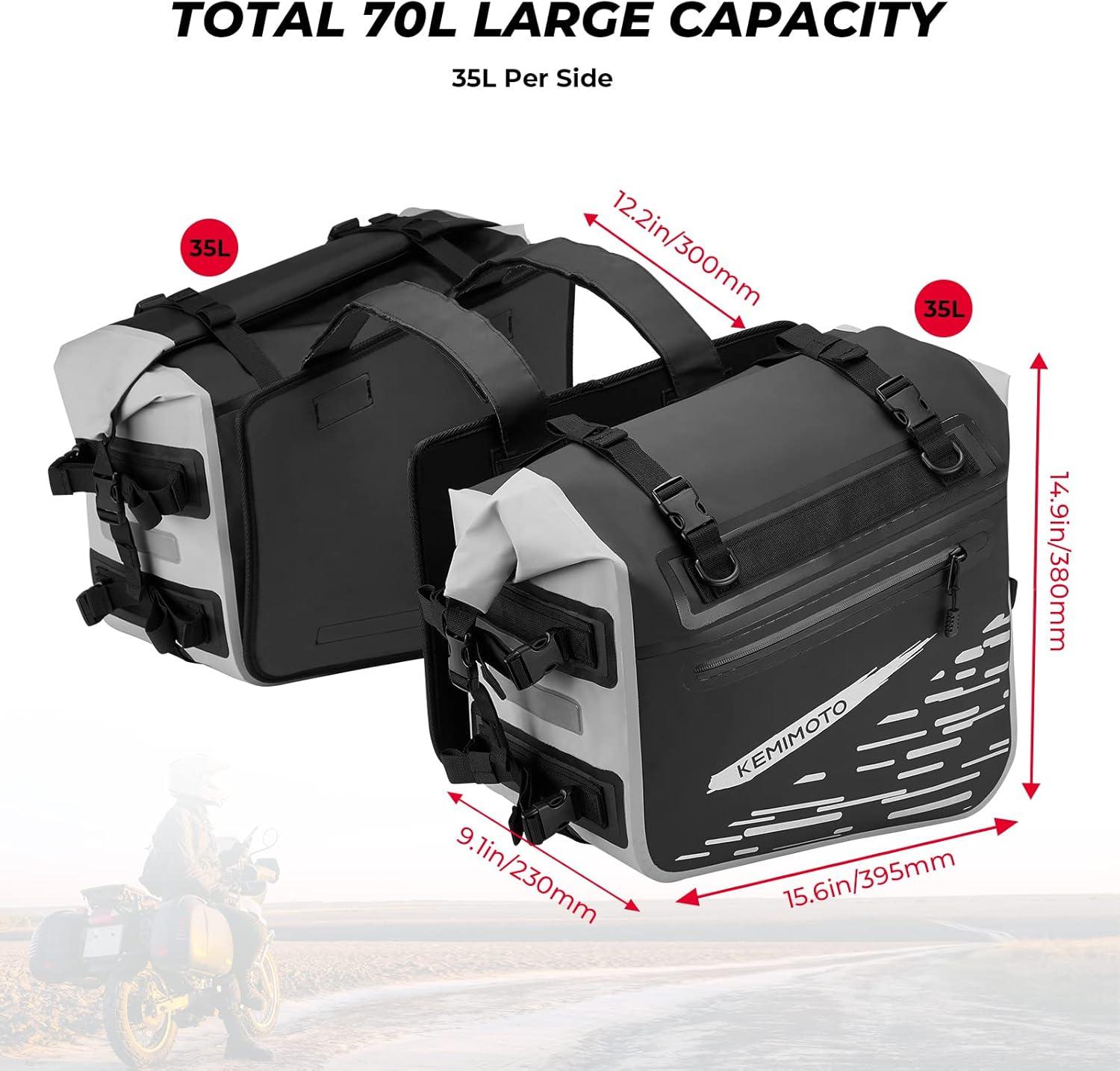 LARGE CAPACITY: Total 70L capacity of the side saddle bags. There is 35L per side of the bag. Could meet the storage needs of long-distance and short-distance travel. Applicable models include Adventure, Dual Sport motocycles, Dirt Bike etc. (PLEASE DO NOT LET THE BAGS DIRECTLY CONTACT THE HOT EXHAUST PIPE TO AVOID SCALDING THE BAGS)