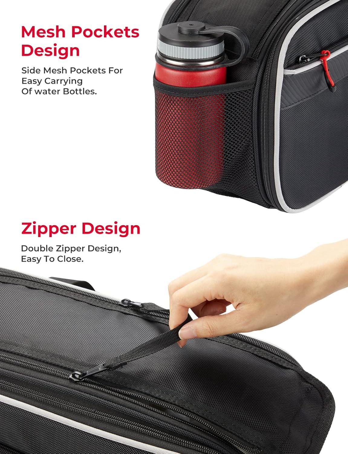 Design: Double-end zipper design for easy closure. The side mesh design can place the water bottle, and the side saddle bag with a REFLECTIVE STRIP design, ensure your travel safety at night, on cloudy days, and in rainy weather.