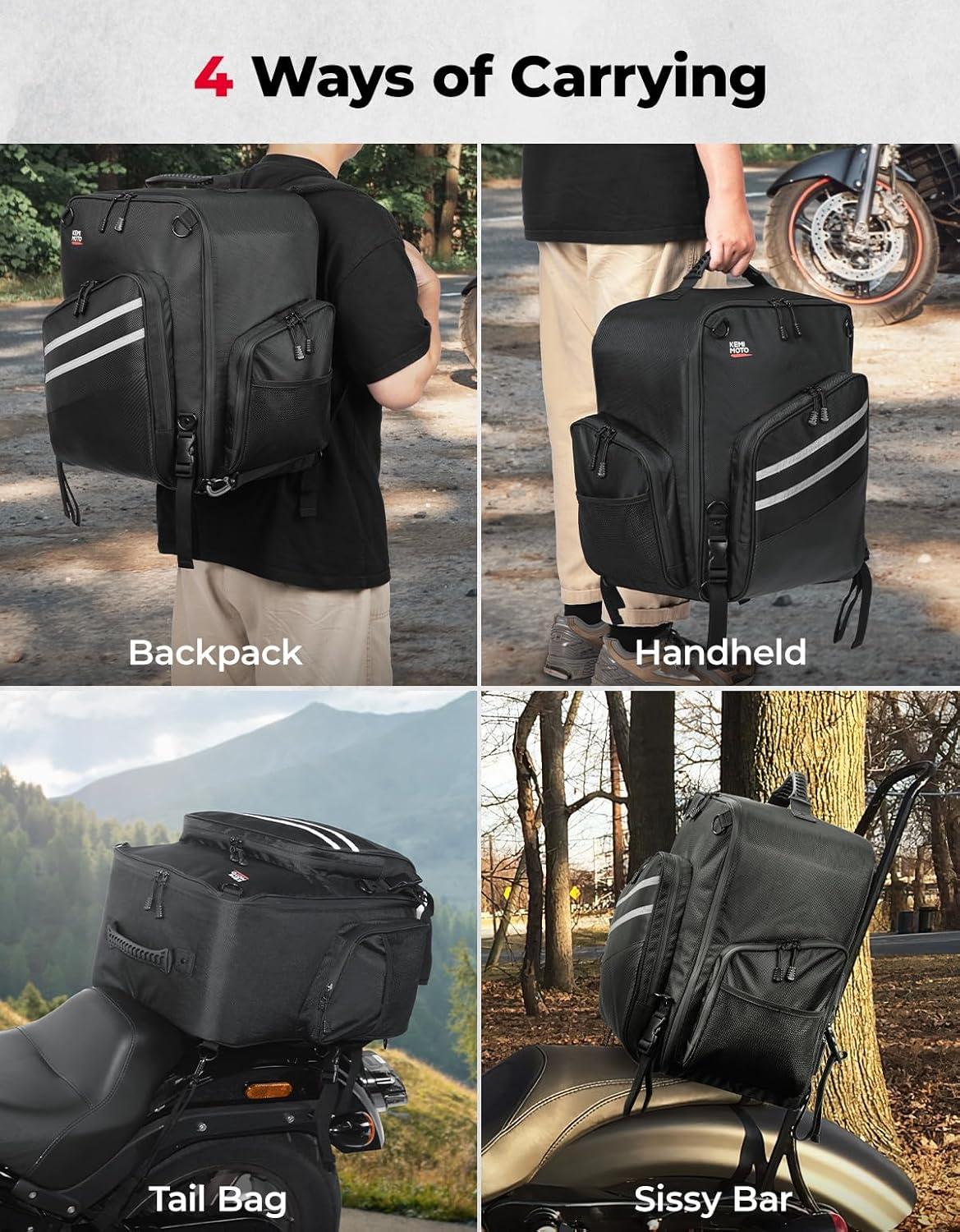 Versatile Design: KEMIMOTO luggage helmet bag features multi-functionality, as it can be mounted on the tail rack, rear seat, and sissy bar, as well as used directly as a backpack to meet various needs, such as motorcycle riding, hiking, or daily use for motorcycle enthusiasts
