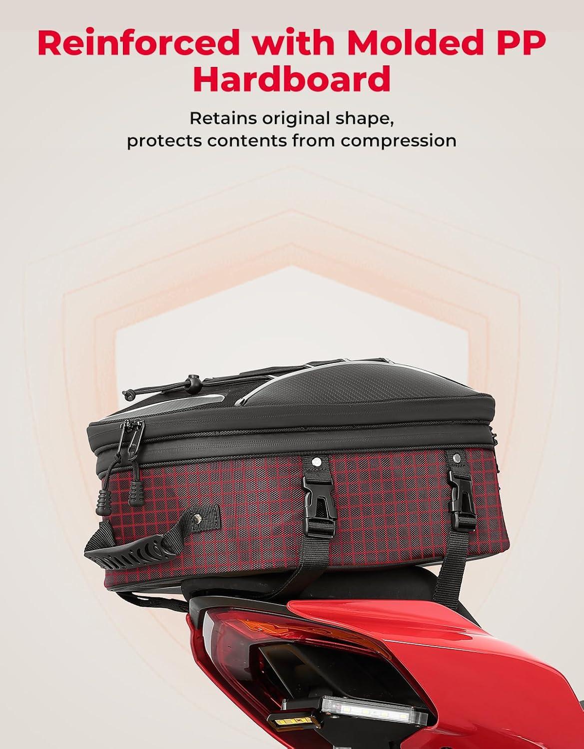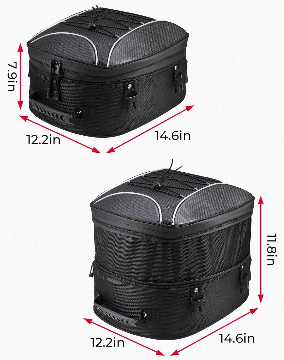 【22-34L Expandable Capacity】This motorcycle tail bag can be expandable to 34 Liter. Size: 14.6″L x 12.2″W x 7.9″H Standard / 14.6″L x 12.2″W x 11.8″H Expanded. Large storage room for carrying clothes, shoes, helmet, Ipad, and lunch. Compatible for most motorcycle models such as CB600RR, iron883, MT10, FZ07 09, R1200GS. NOTE: Doesn't fit dirt bike and bicycle.