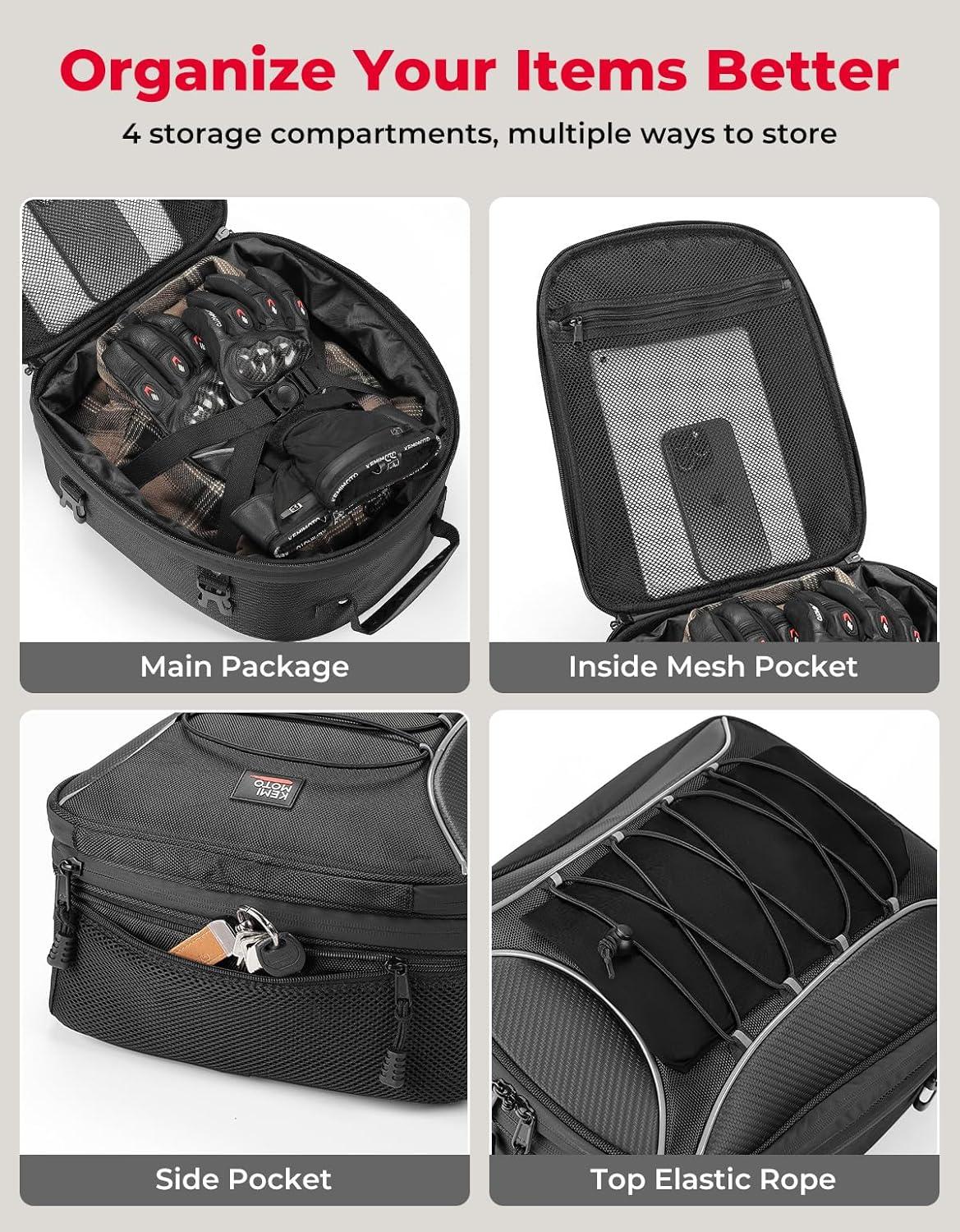 【Practicality and Versatility】There is a zipper side pocket for store wallet, keys, cigarette, goggle; A main internal mesh bag for store Ipad, gloves, lunch; 22L-34L Expandable Large Capacity for store luggage, camera, and can store full helmet, half helmet, racing helmet.