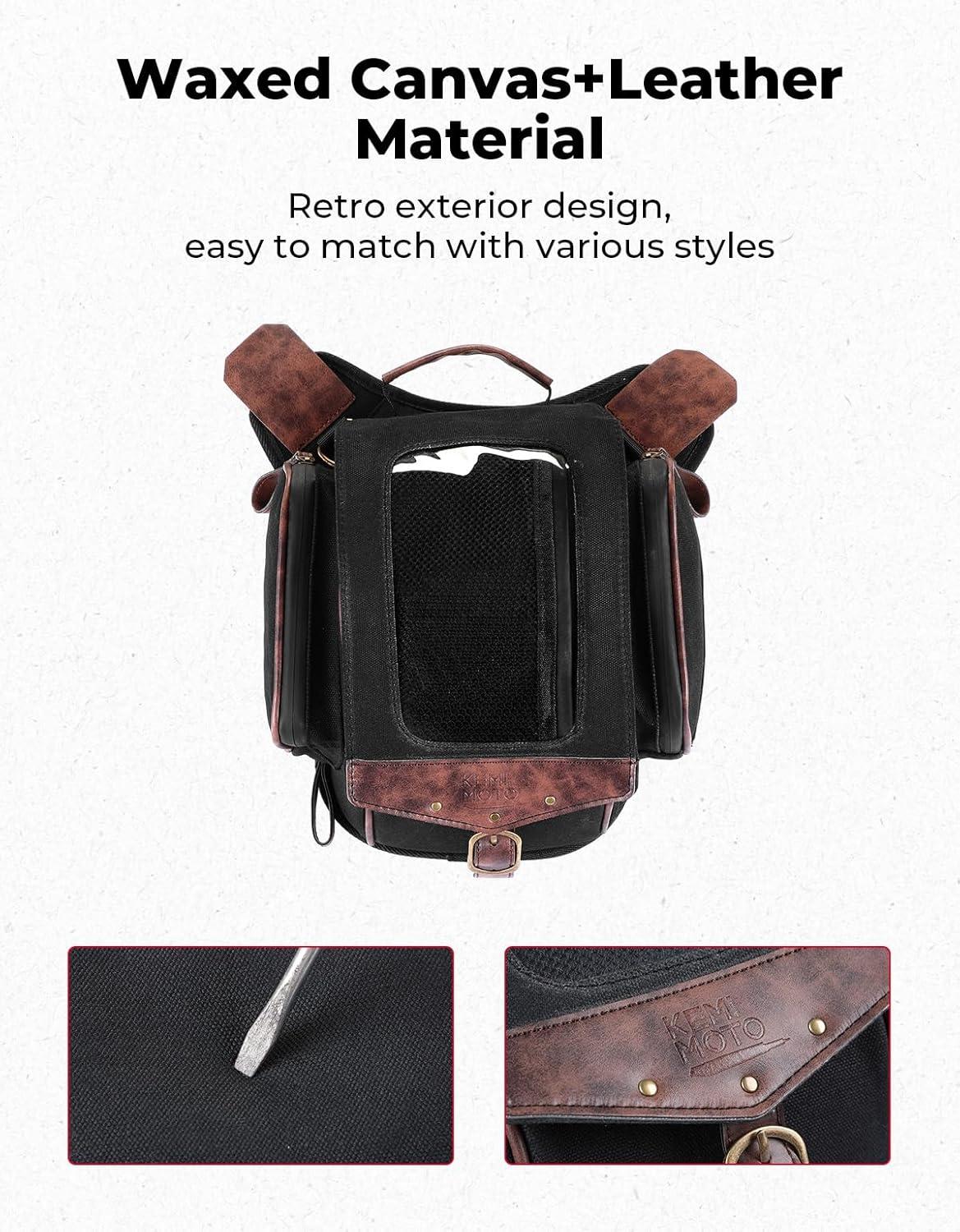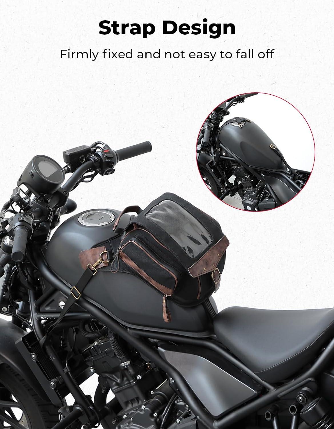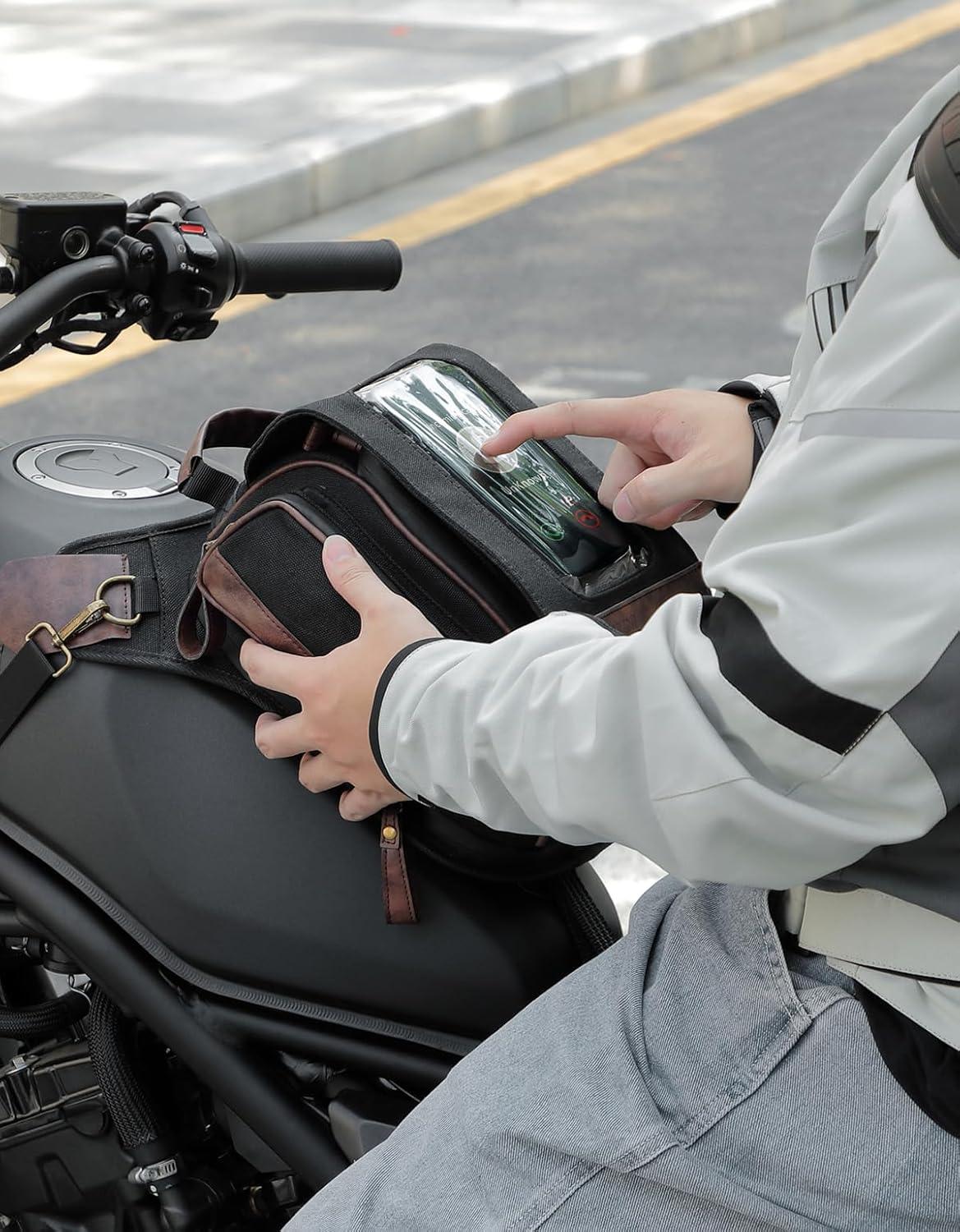 Versatile Applications: Our motorcycle tank bag made of waxed canvas material and equipped with a rain cover, allowing you to ride worry free in the rain. The tank bag equipped with a touch screen film, allowing you to safely operate your phone while riding