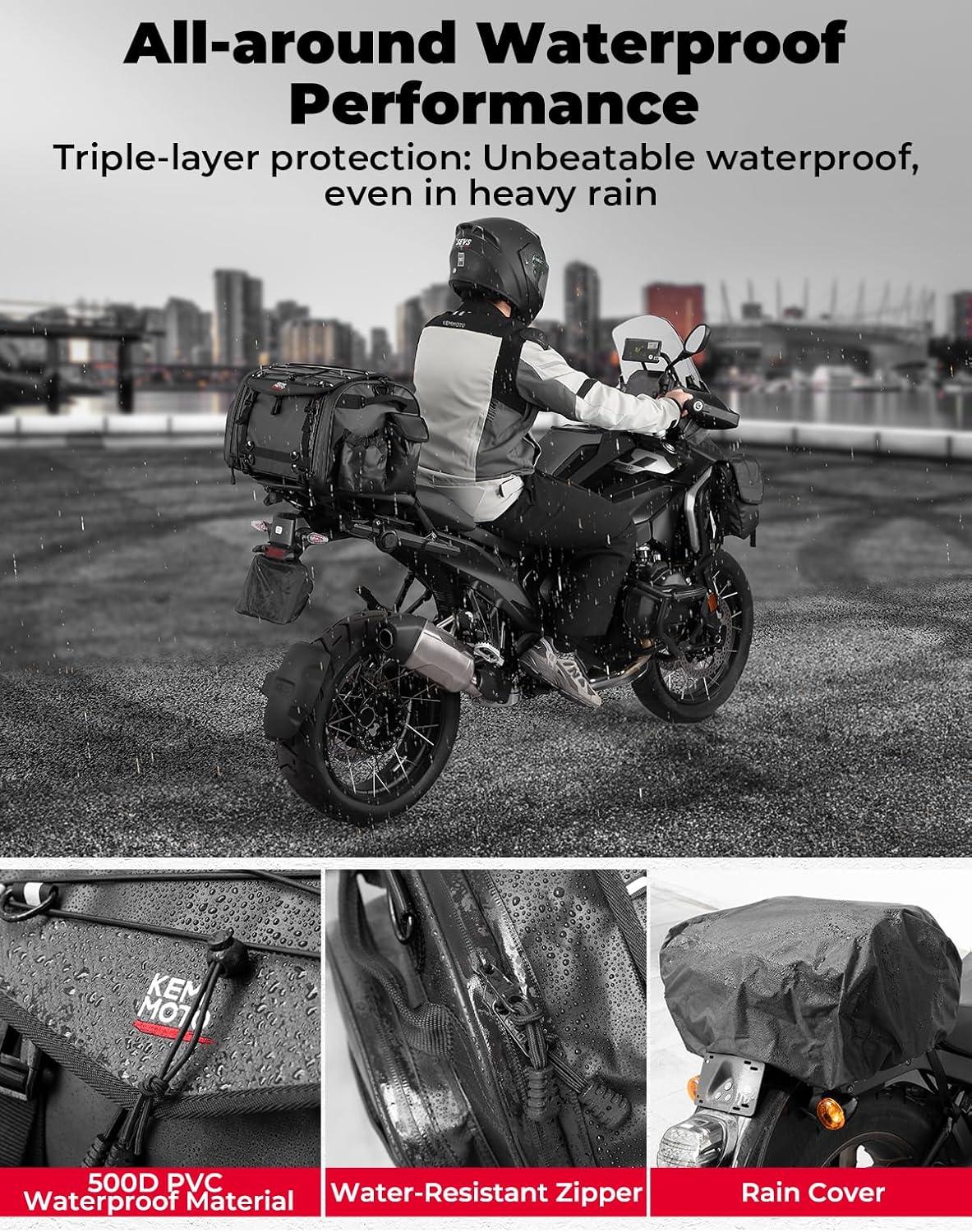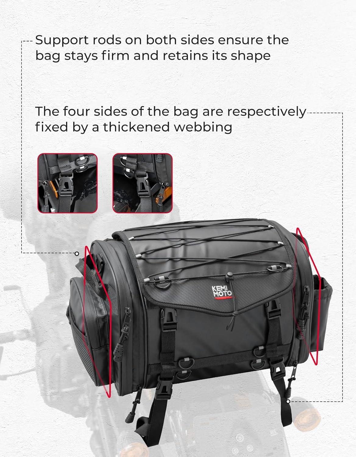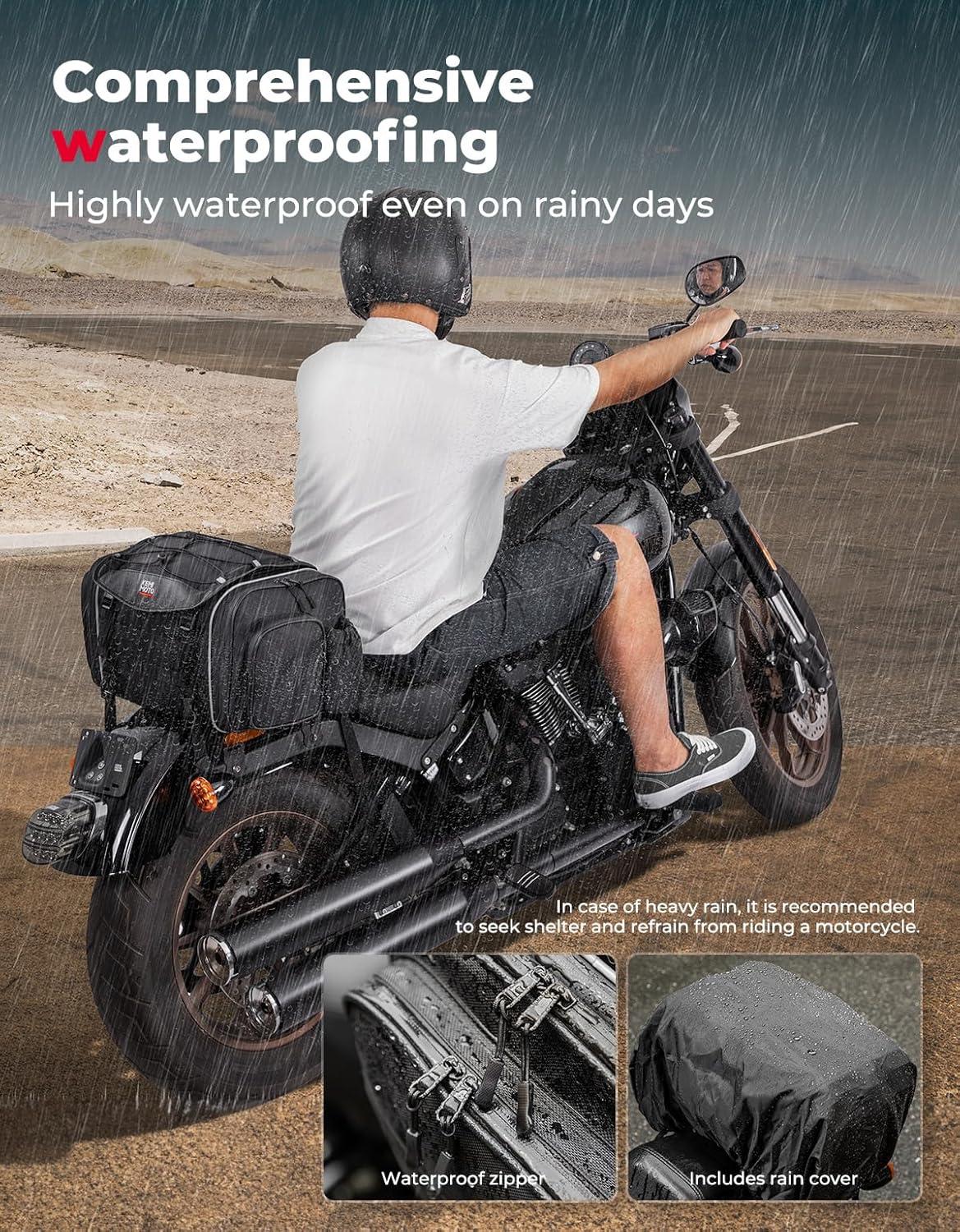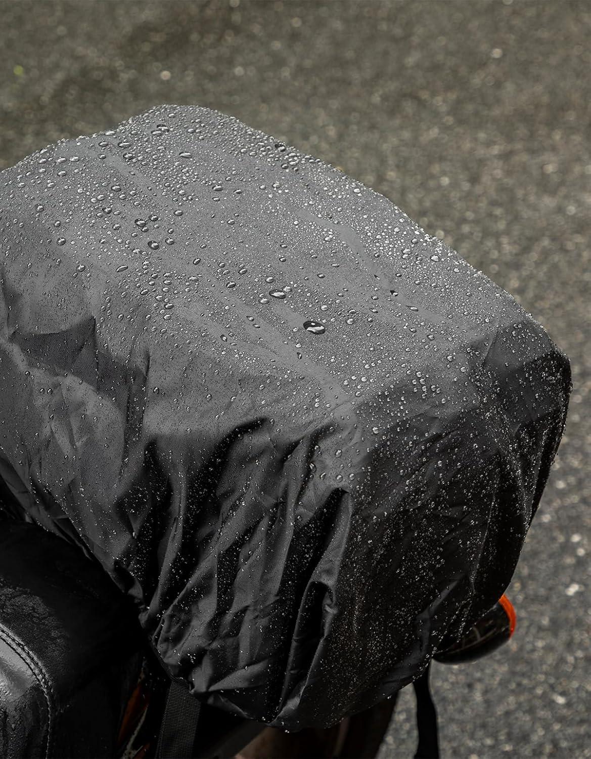 Enhanced Waterproofing: Our spacious motorcycle tail bag is crafted from PVC clip mesh material, ensuring exceptional water resistance, durability, and tear resistance. It effectively shields your belongings from water, dust, and dirt, even in the harshest weather conditions. To further safeguard your items, we include a waterproof rain cover, which can protect your bags in light rain and on dusty roads.