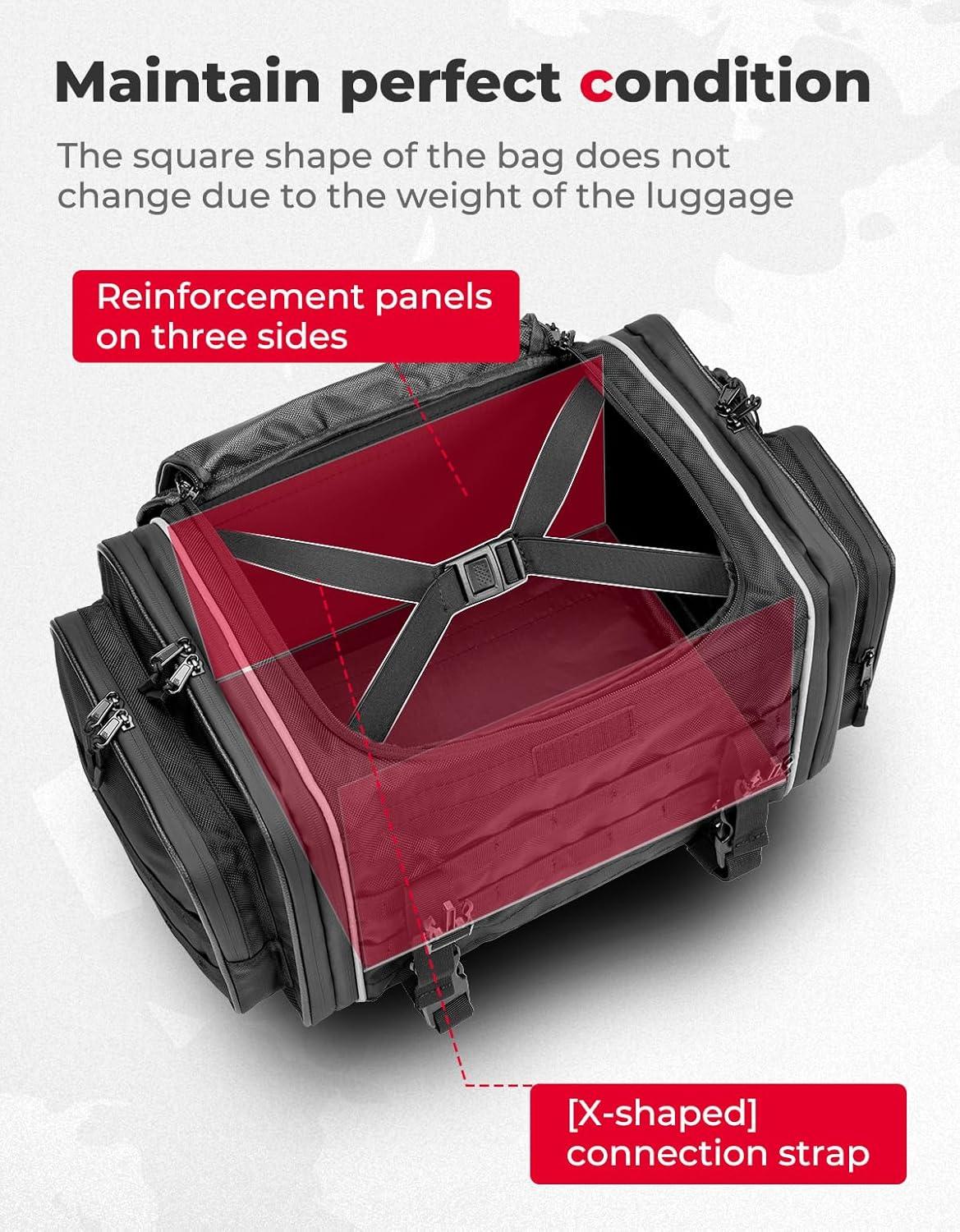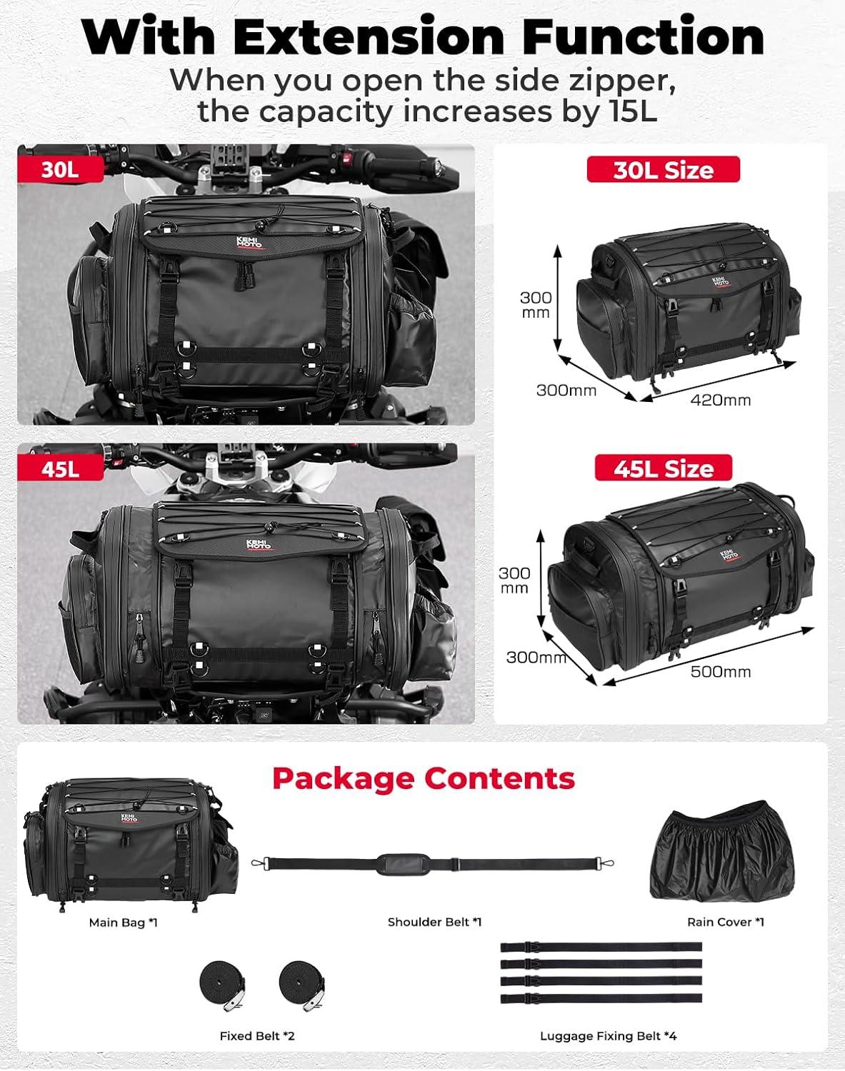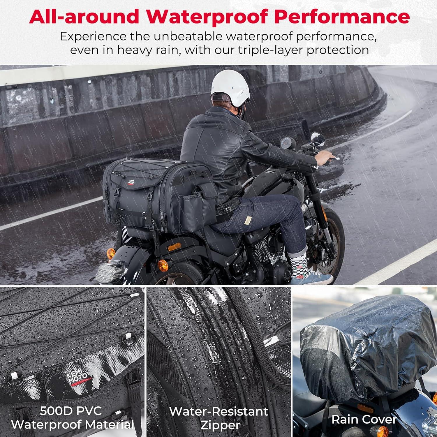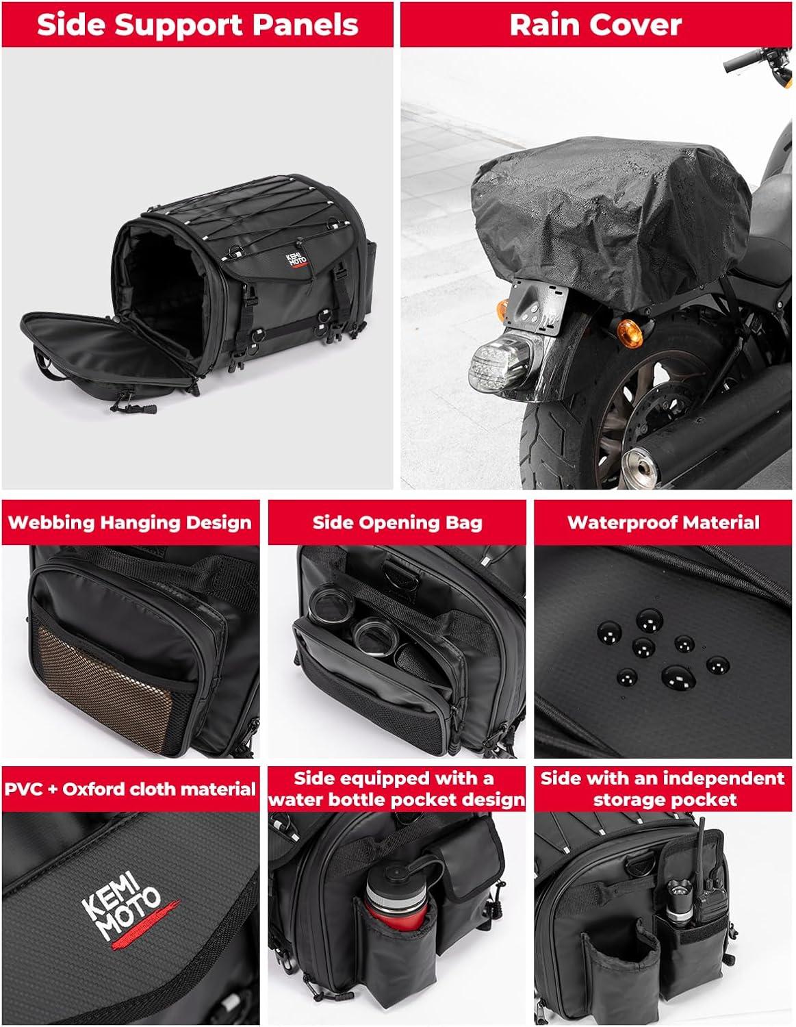 Enhanced Waterproofing: Our spacious motorcycle tail bag is crafted from PVC clip mesh material, ensuring exceptional water resistance, durability, and tear resistance. It effectively shields your belongings from water, dust, and dirt, even in the harshest weather conditions. To further safeguard your items, we include a waterproof rain cover, which can protect your bags in light rain and on dusty roads.