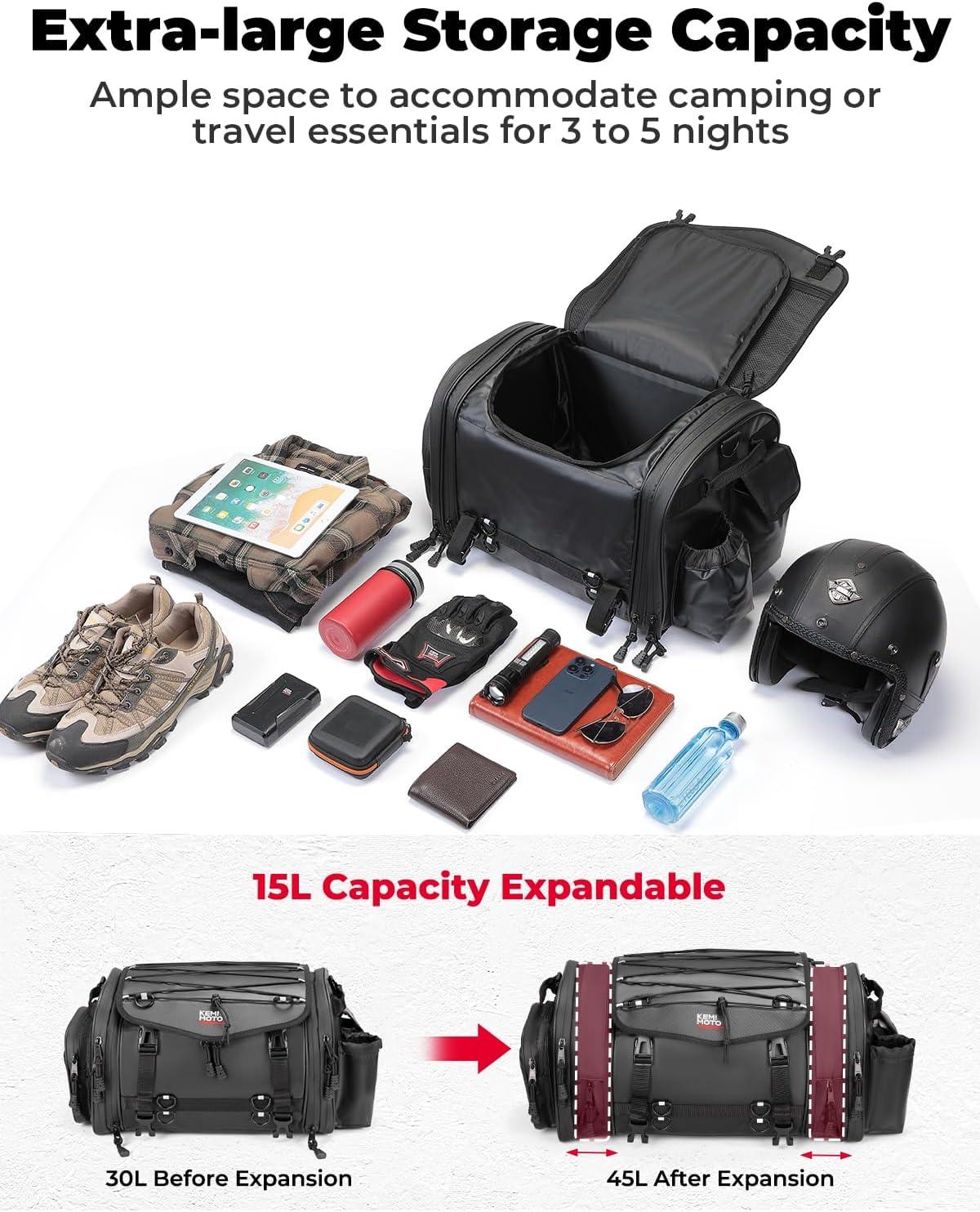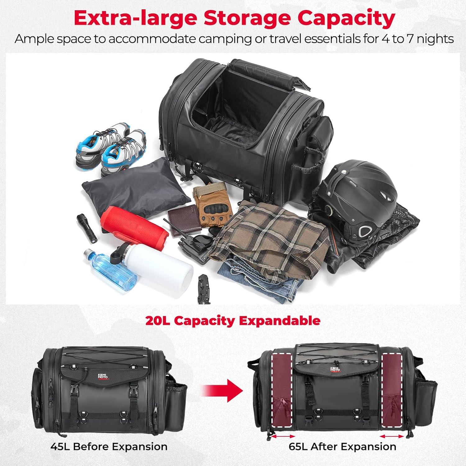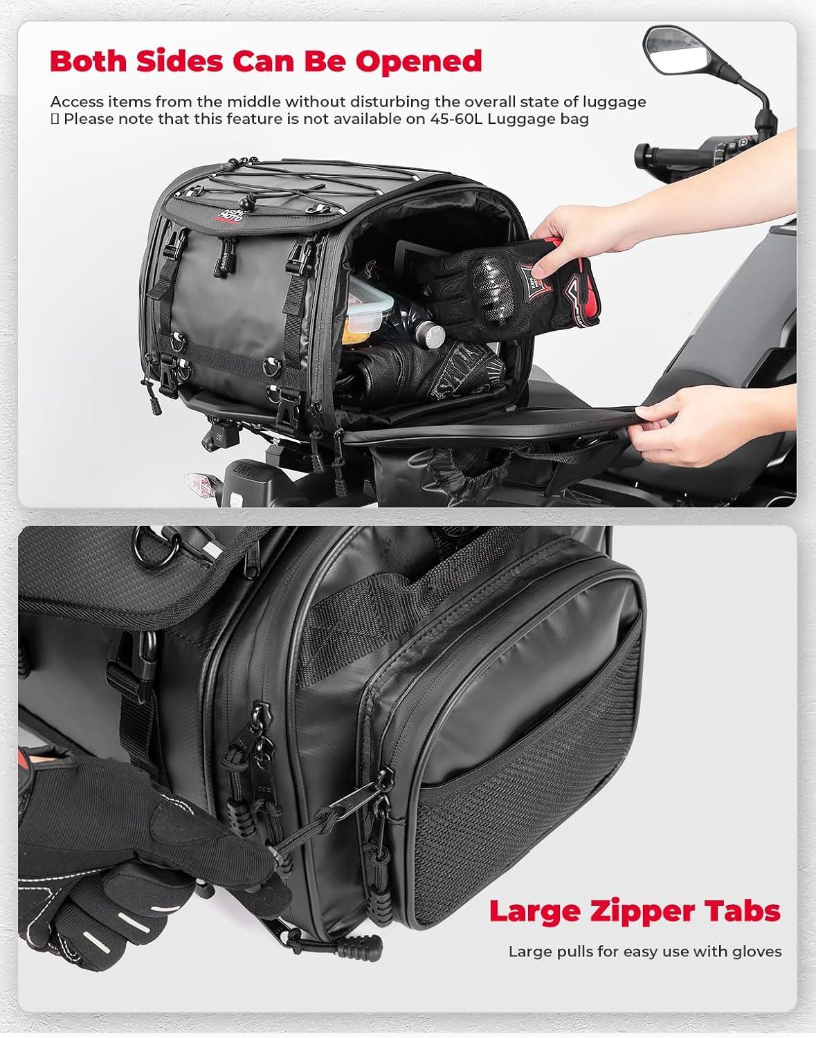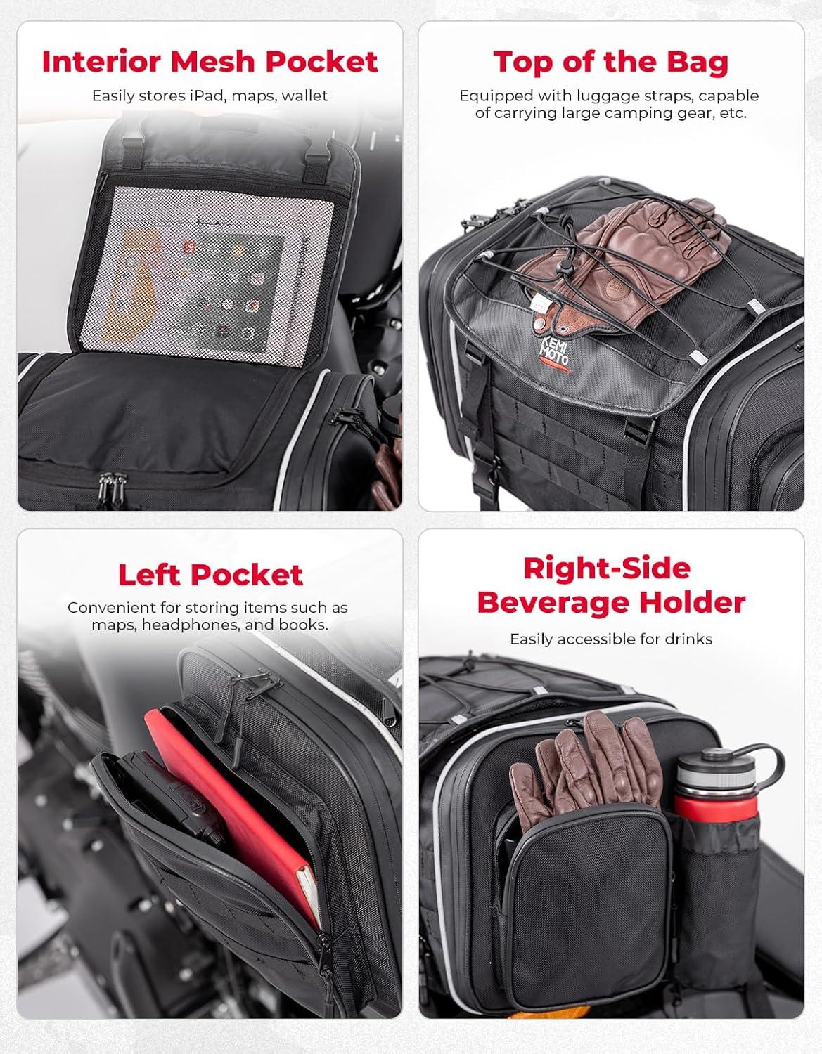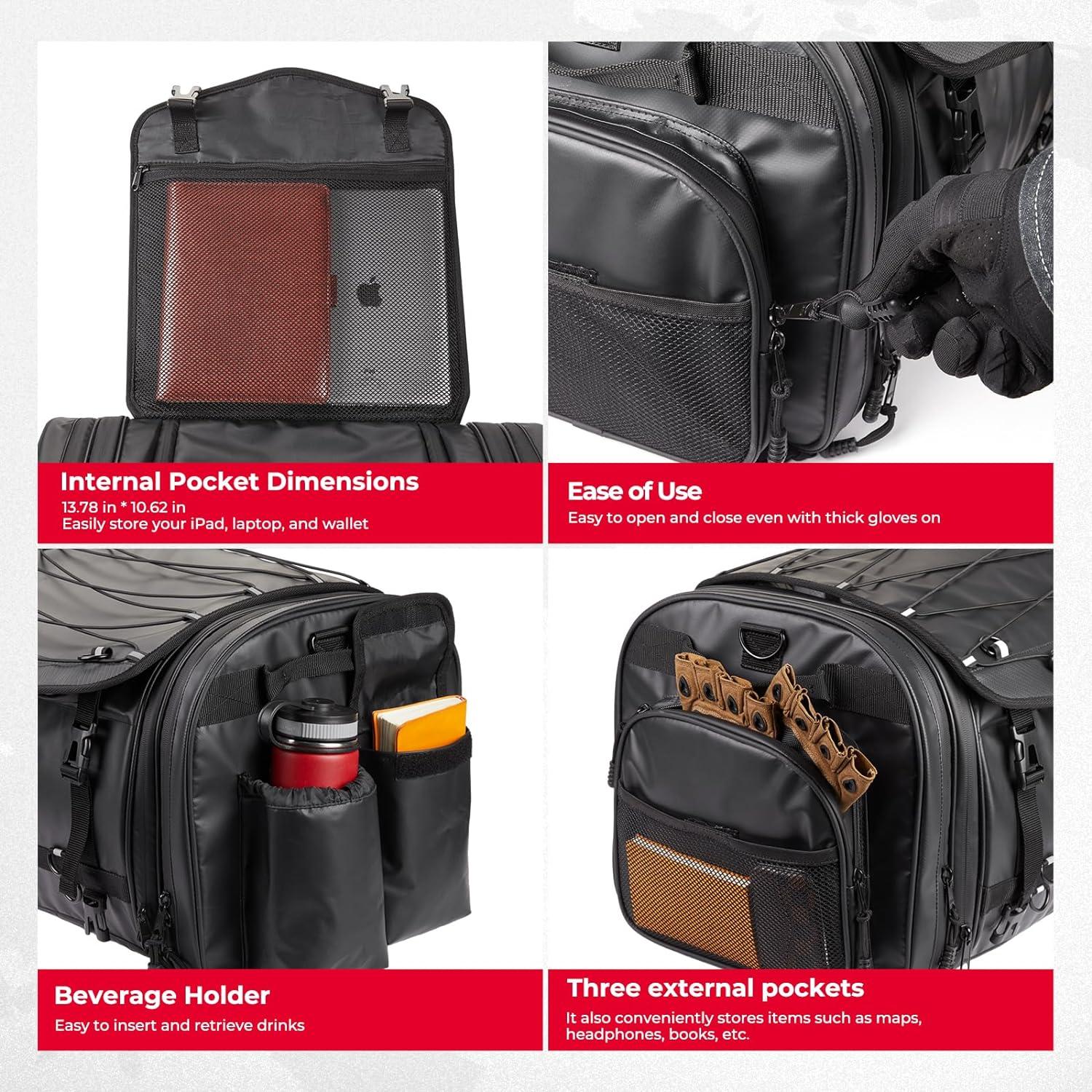 Spacious and Convenient: With a generous 60L capacity, this motorcycle seat bag easily accommodates all your daily needs. Plus, it features small side pockets for quick access to items like water bottles and snacks, eliminating the need to open the entire backpack. This saves you time and energy, making it incredibly convenient for any adventure, from road trips to motorcycle camping. Trust this motorcycle luggage to be your ultimate companion.