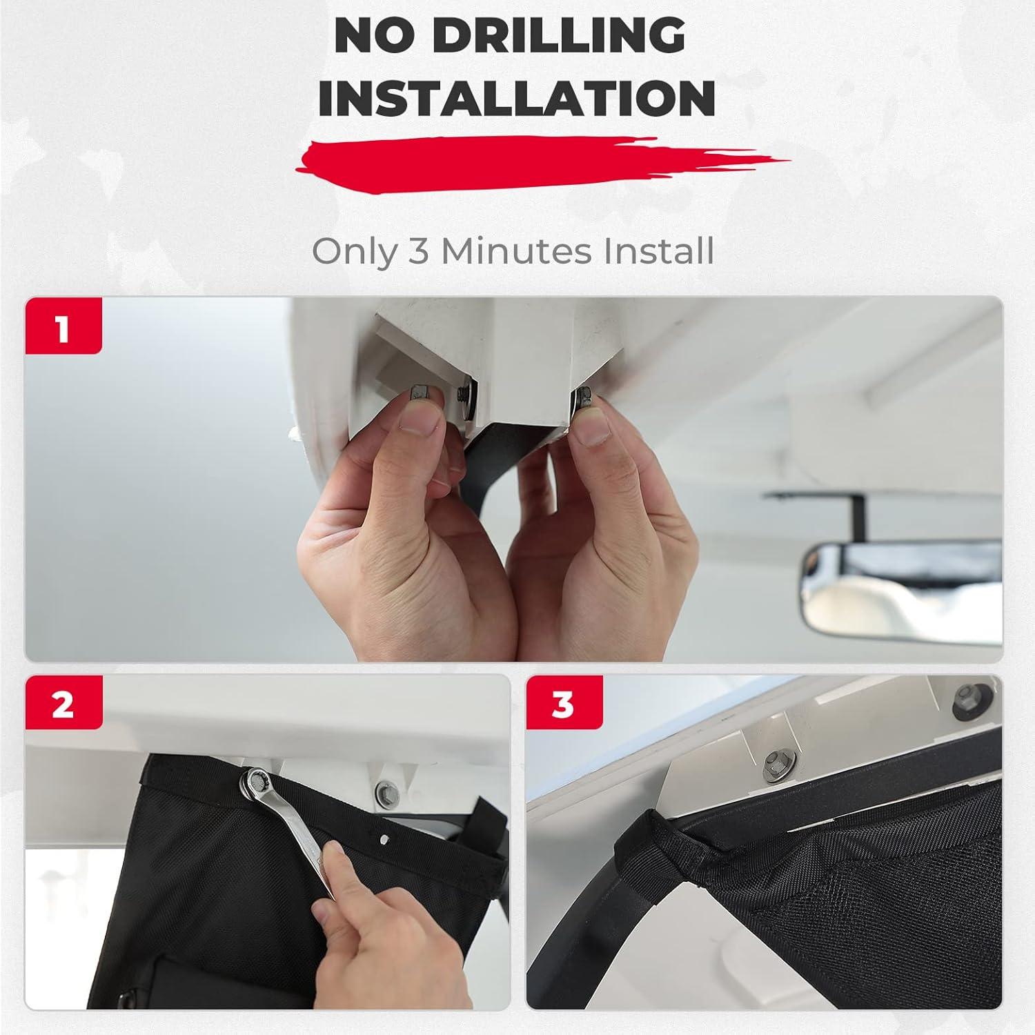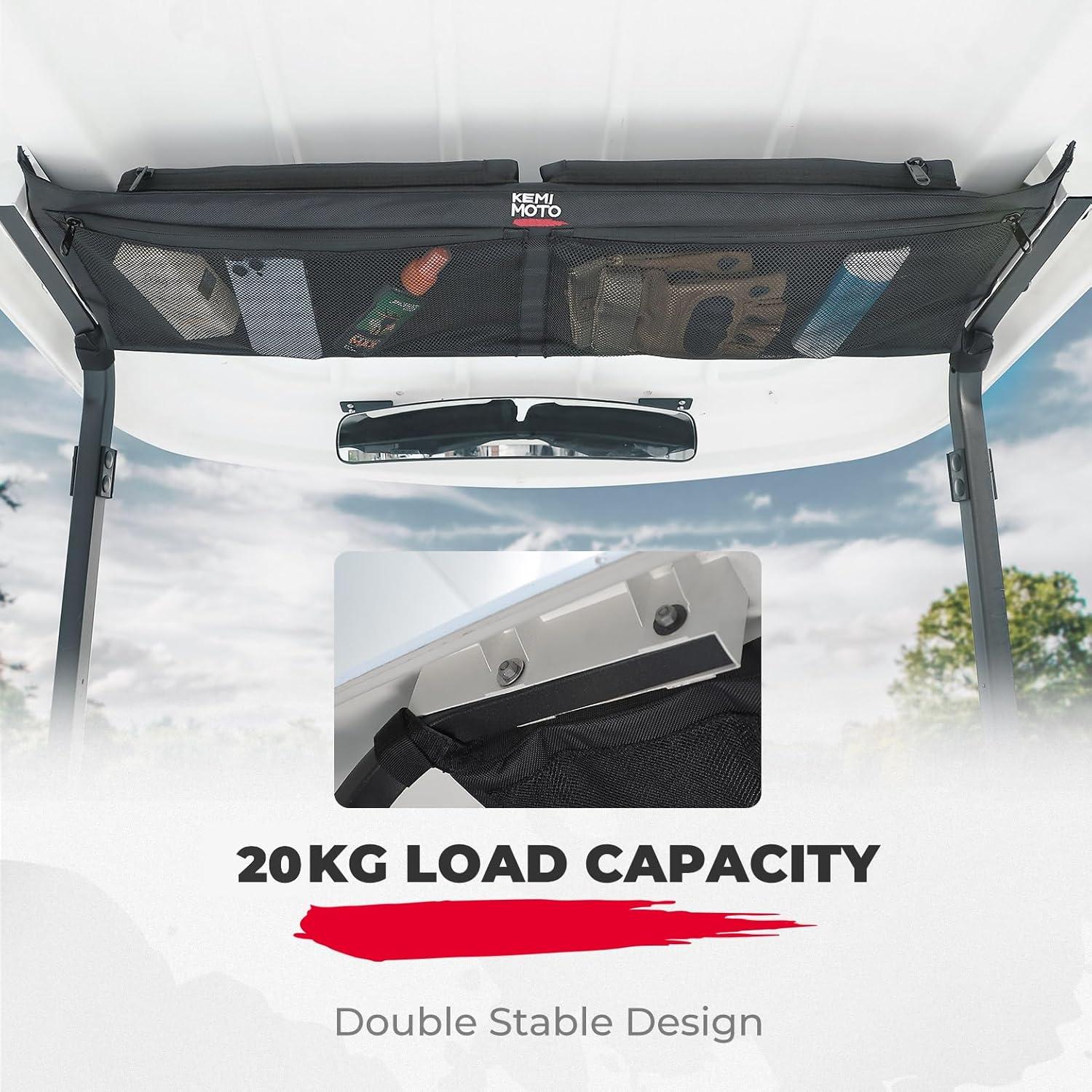 No Drilling Required: KEMIMOTO golf cart overhead storage bag is easy to install. Just use the original screws and hook-and-loop fasteners to attach it firmly to the roof; there's no need to drill holes and potentially damage the body. Installation only takes 3 minutes