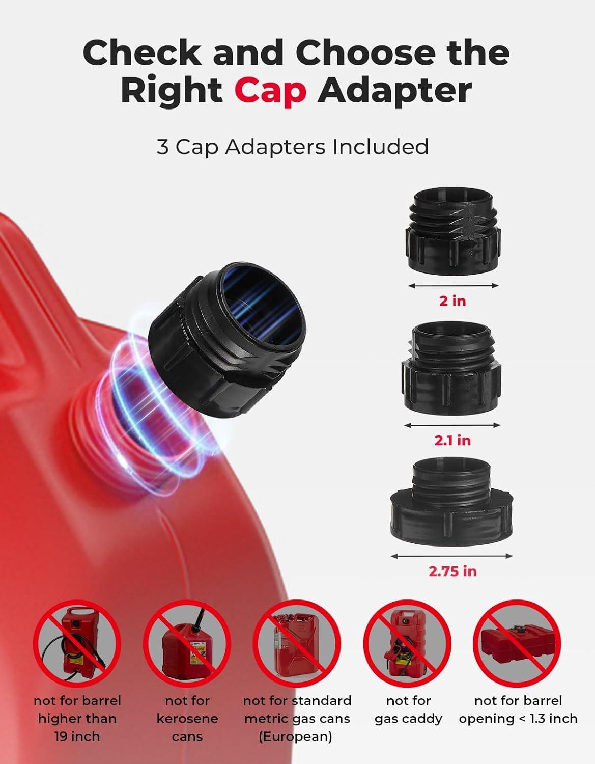 Universal Compatibility: Includes 3 gas can adapters (2.0″, 2.1″, 2.75″) , fits most oil drum ports. The 51 inch polyethylene hose is reinforced, rustproof, corrosion-resistant, and suits for long-distance transfers