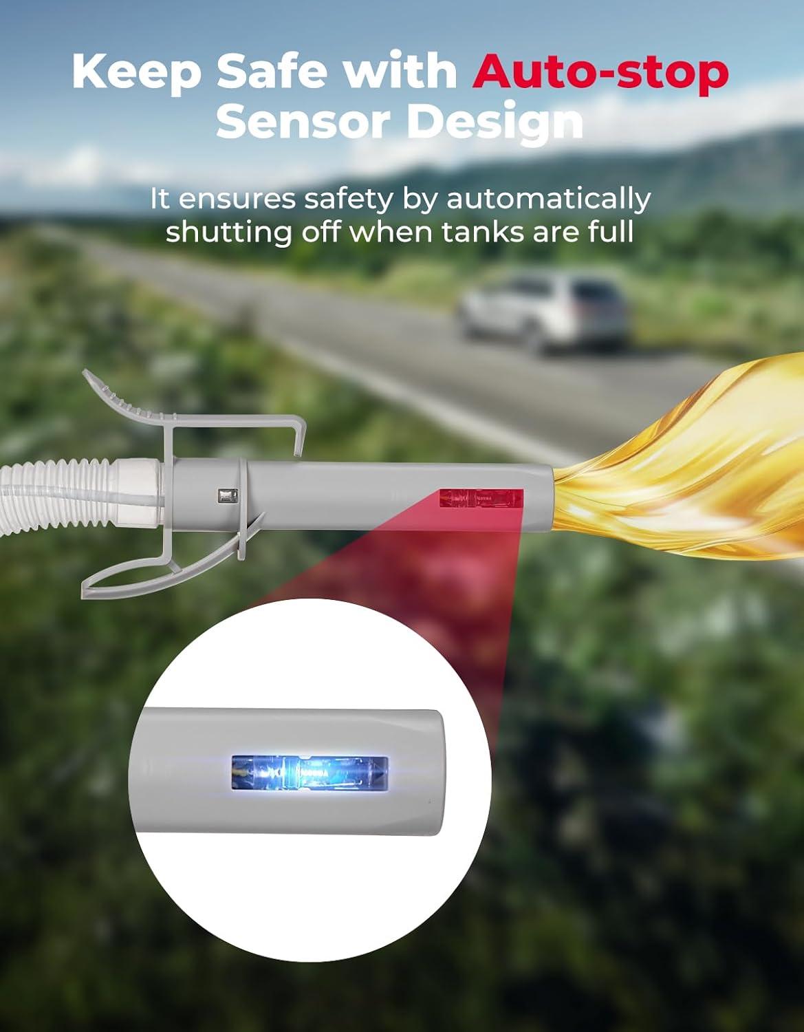 Enhanced Safety with Auto Shut-Off: This gas transfer pump is equipped with an automatic shut-off nozzle sensor to prevent spills, leaks, and overflows. It automatically stops the flow when the tank is full, ensuring a clean and safe refueling process