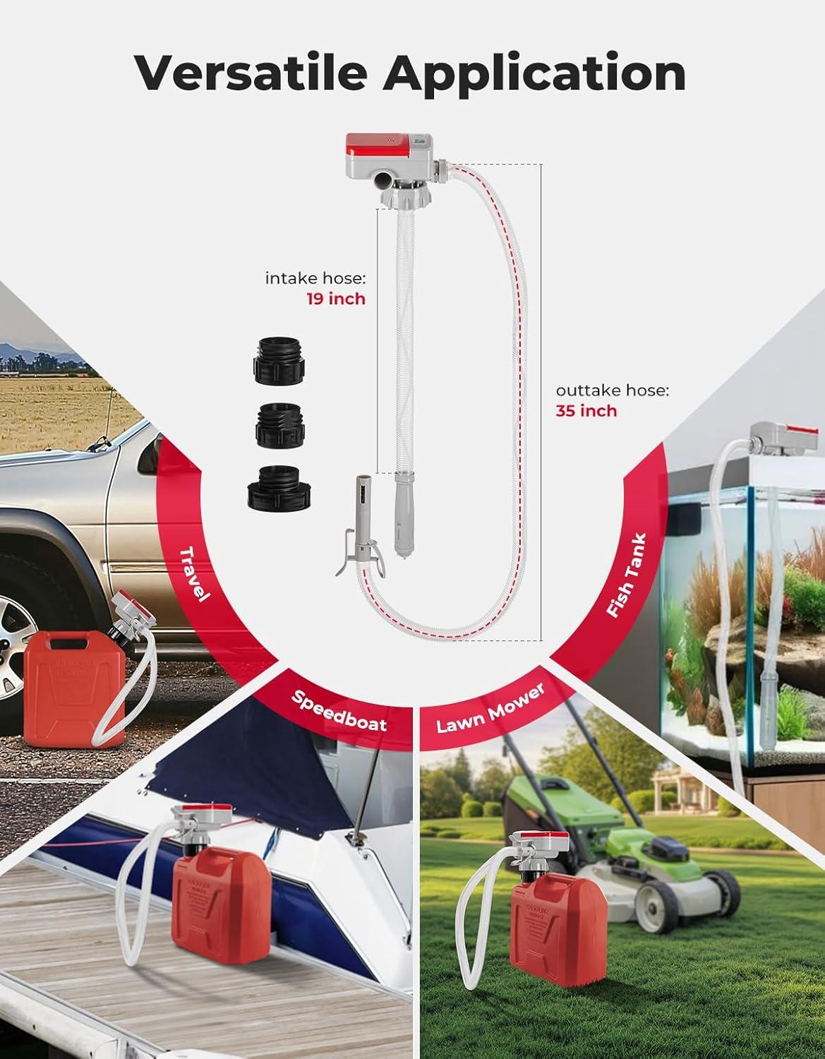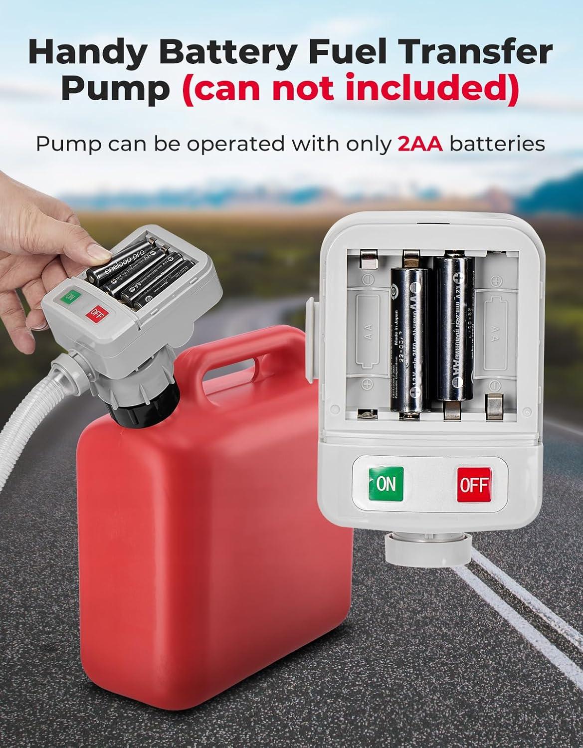 Flexible Battery Power for Emergencies: Powered by 4AA batteries for optimal performance. In urgent situations, it can even operate with just 2AA batteries, making it a reliable emergency solution for unexpected fuel transfer needs.(NOTE: batteries and red gas can are not included)