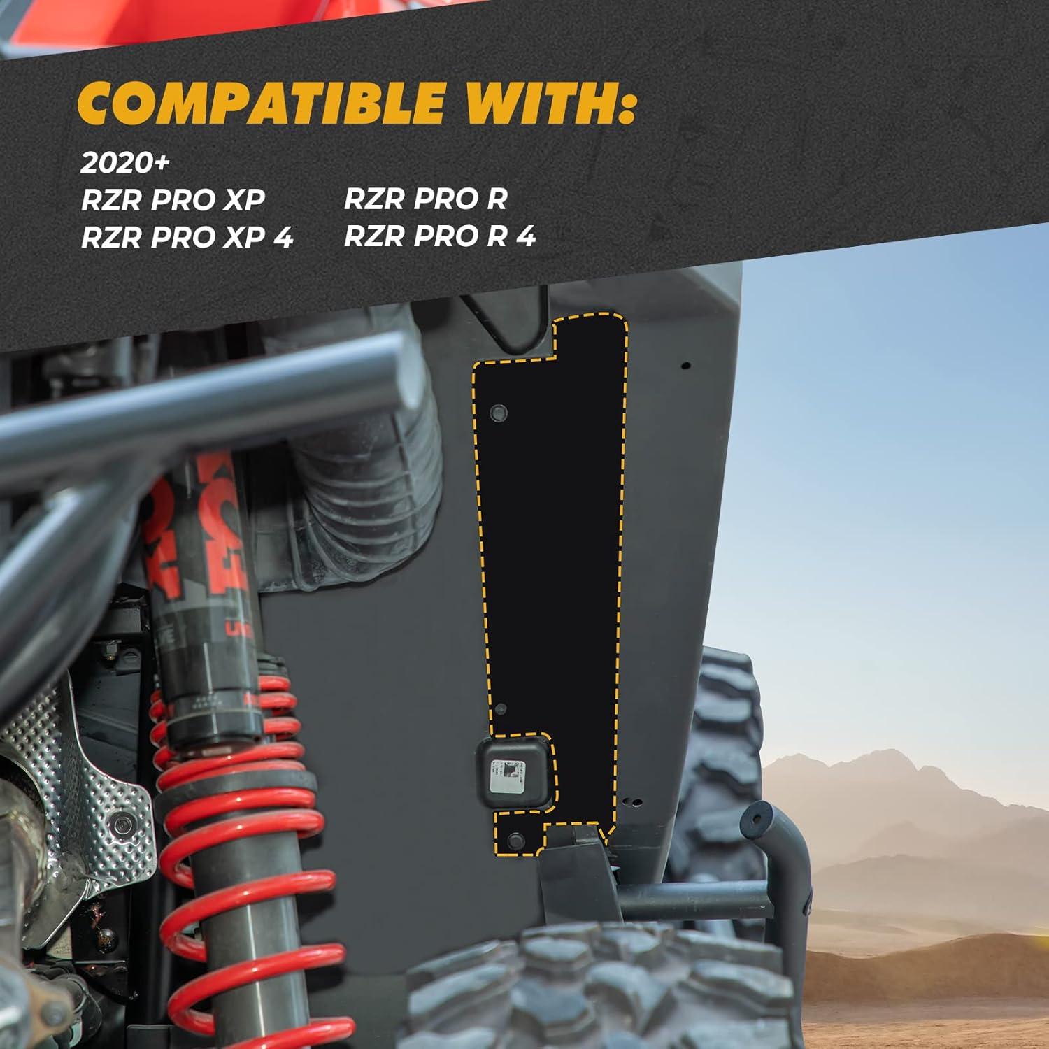 【CUSTOM FITMENT】 Pro XP accessories are compatible with Polaris RZR PRO XP /PRO R 2-seat and 4-seat models. Included: 2* Wheel well block offs 7* expanded rubber nail. 2020-2025