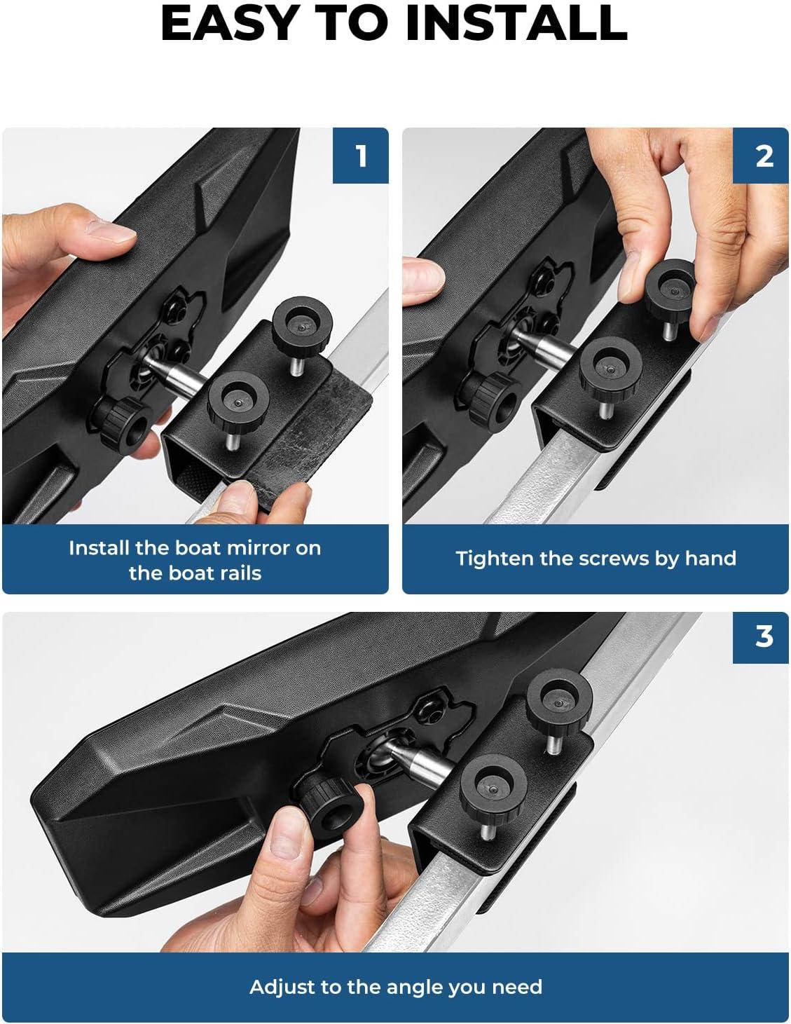 【Easy to install】Our mountable boat mirror is designed with 2 thumbscrews. Just hand-screw the head in and your windshield frame is ready to go.