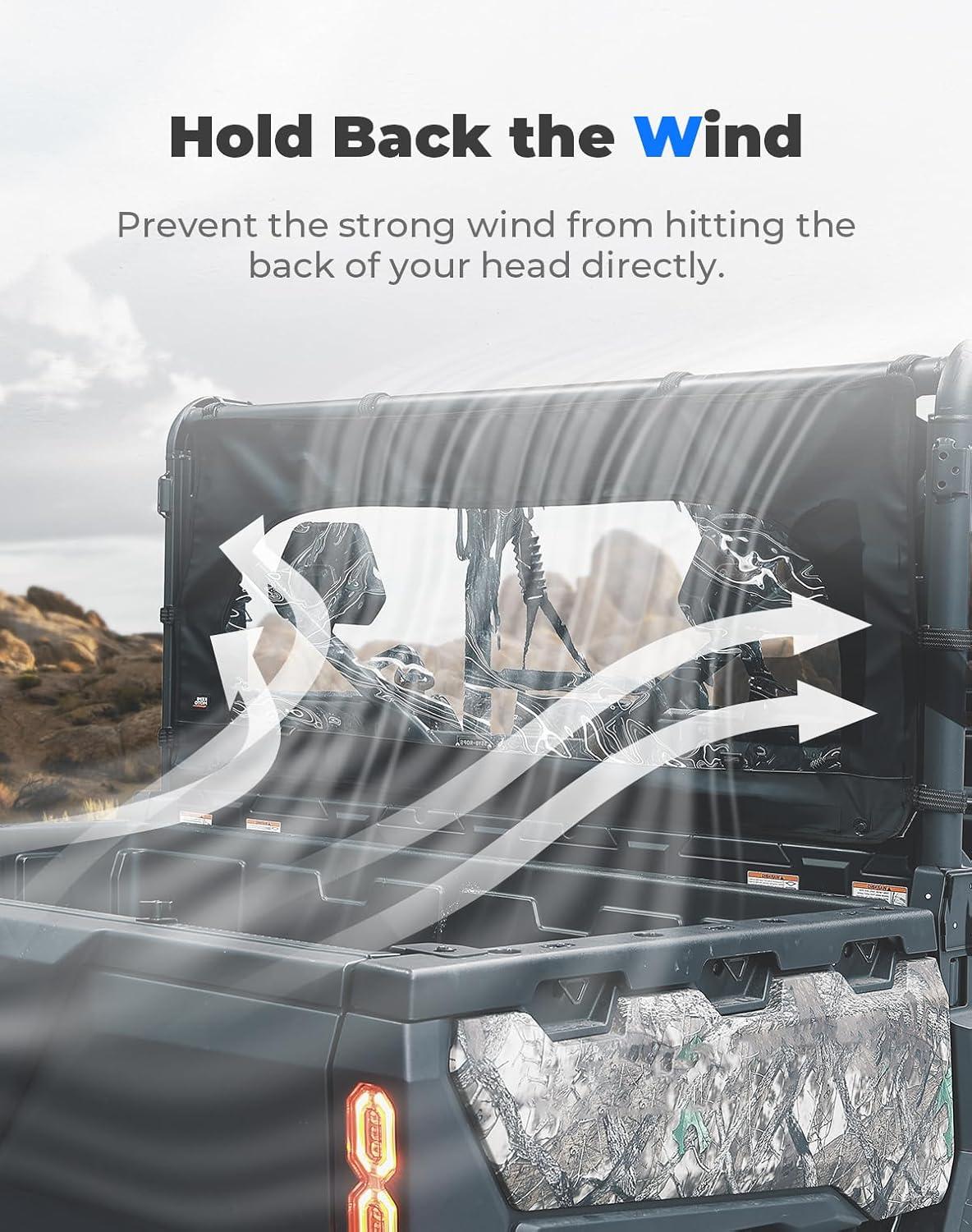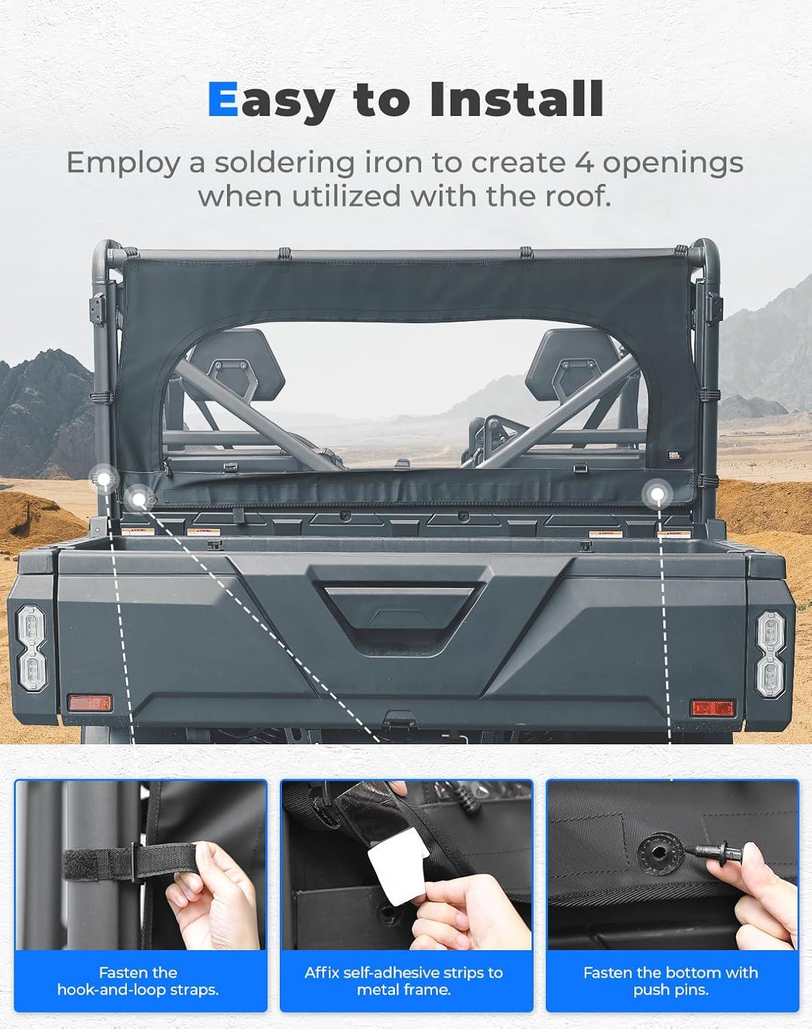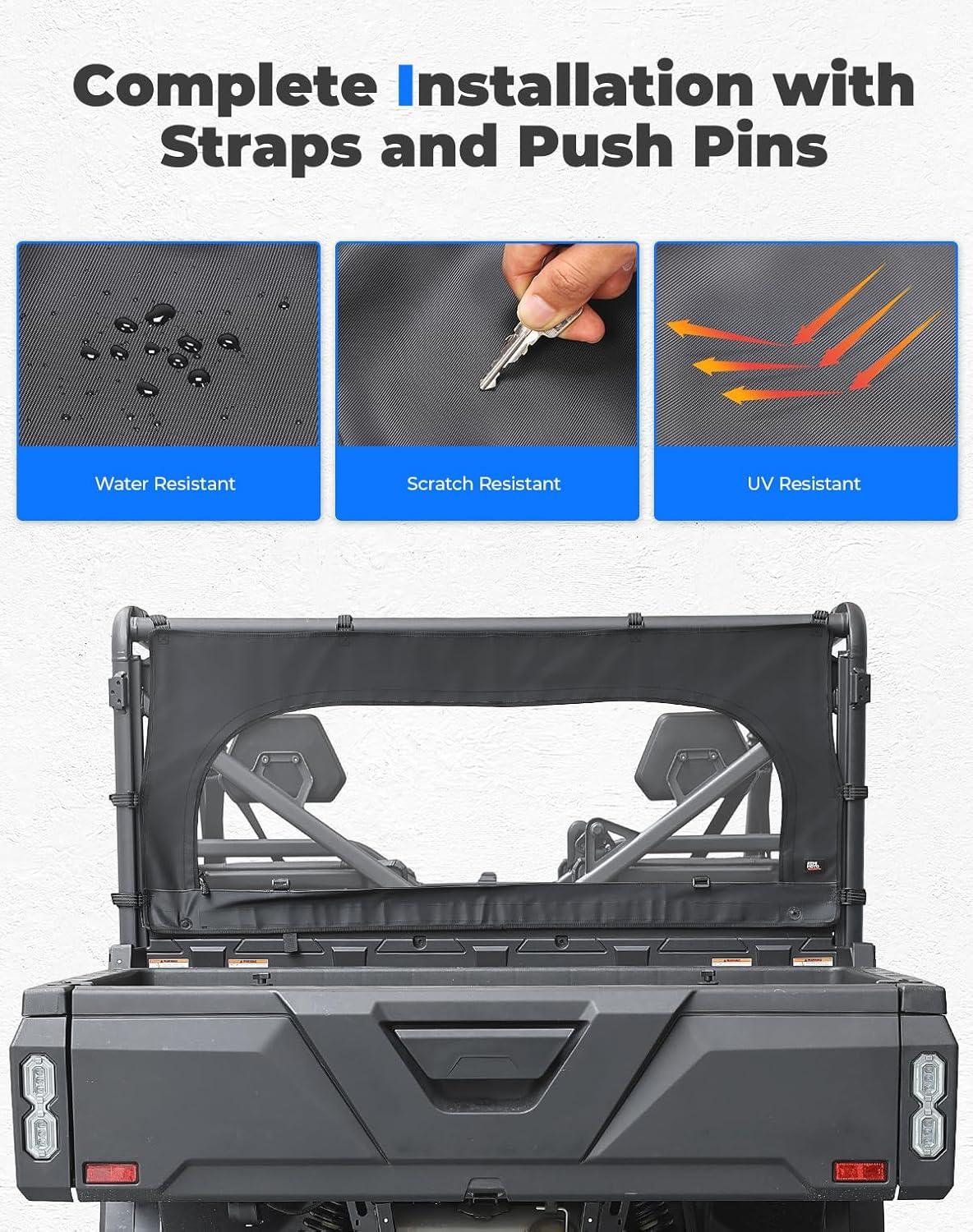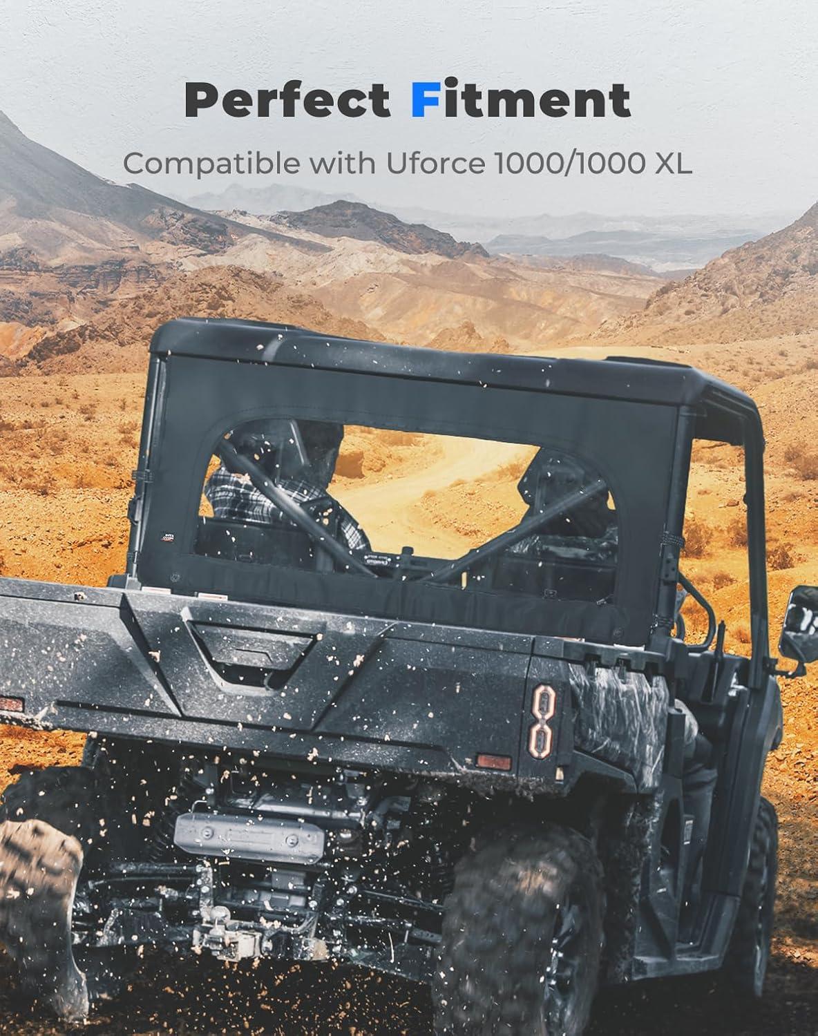 Perfect Compatibility: The KEMIMOTO soft rear windshield is compatible with cfmoto uforce 1000 2019-2025 / uforce 1000xl 2022-2025. NOTICE: For compatibility with the original plastic roof, modifications such as drilling holes for roof screws might be necessary