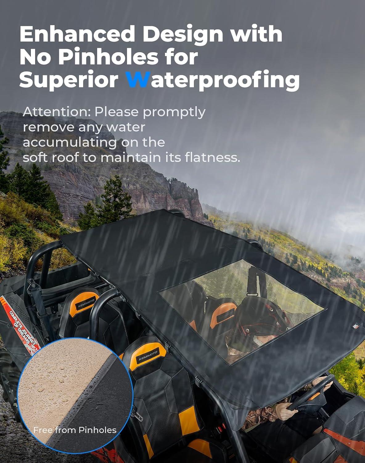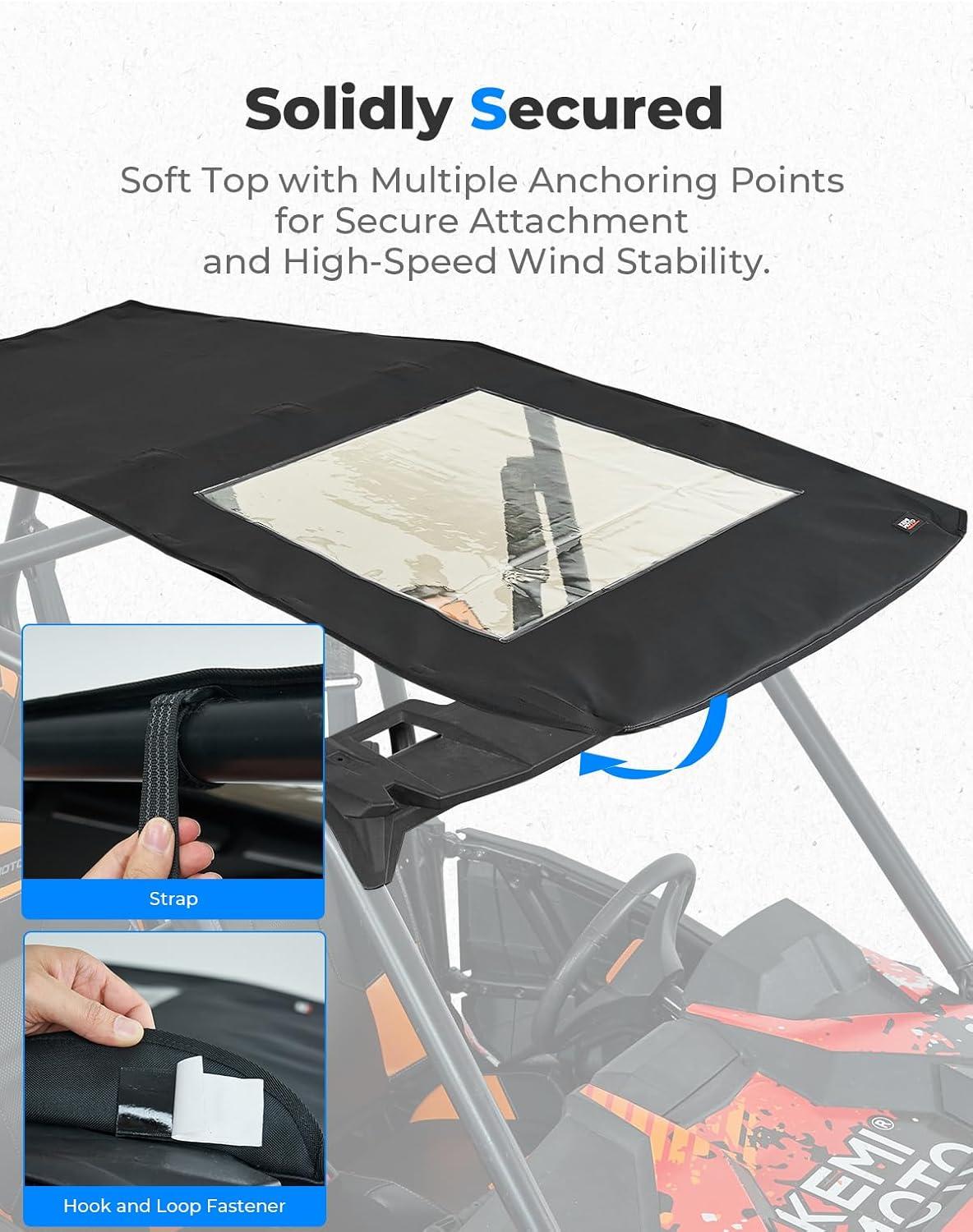 Simple to Install: With no drilling necessary, attaching this soft top is straightforward using the included straps to affix it securely to your vehicle's roof frame. This canvas roof is designed to be compatible with Polaris RZR XP 4 1000 (2014-2023) and fits Polaris RZR XP 4 Turbo / 4 900 models.#2883074 NOTE:To prevent drooping, tighten the straps on the sides. The slip-resistant design ensures they stay secure once fastened