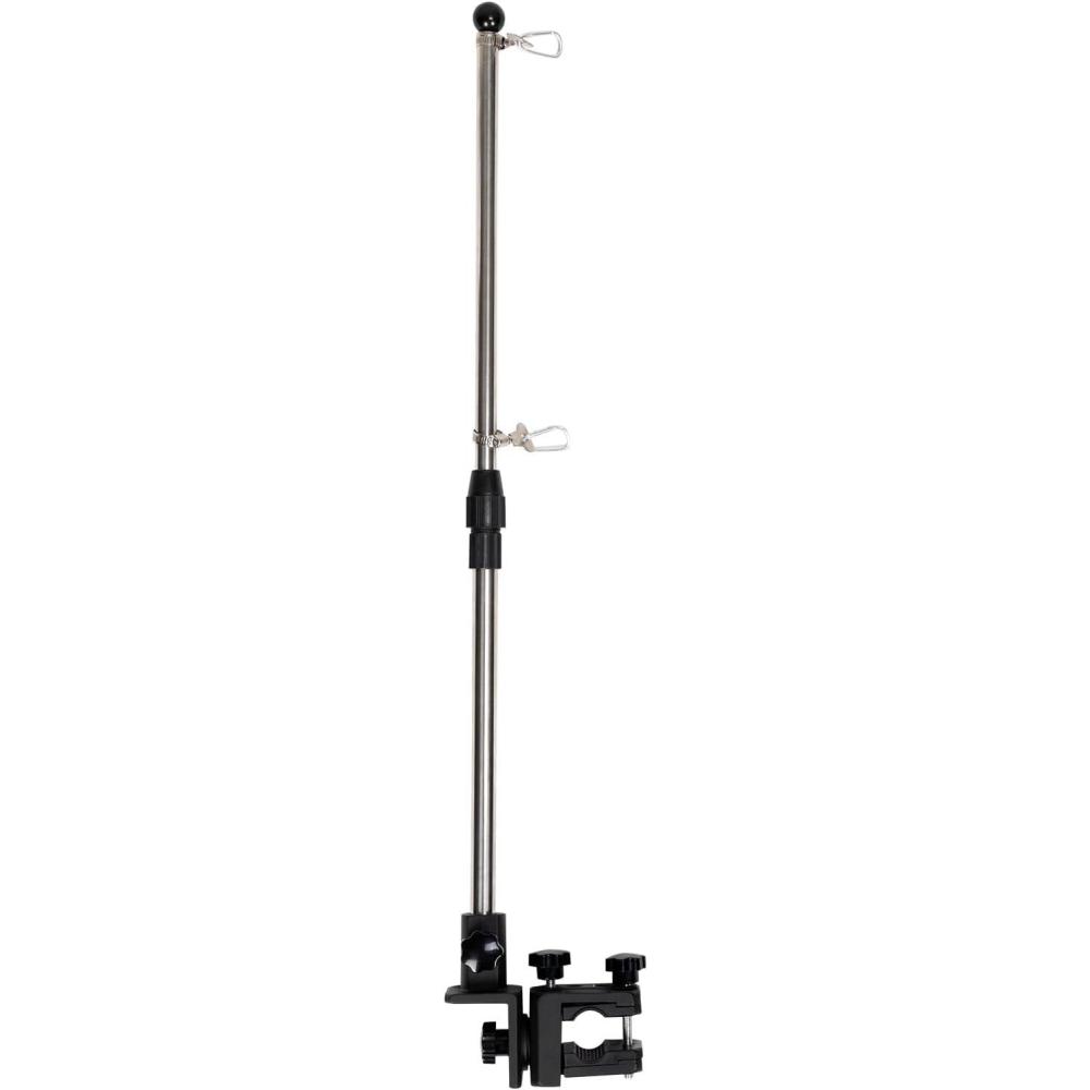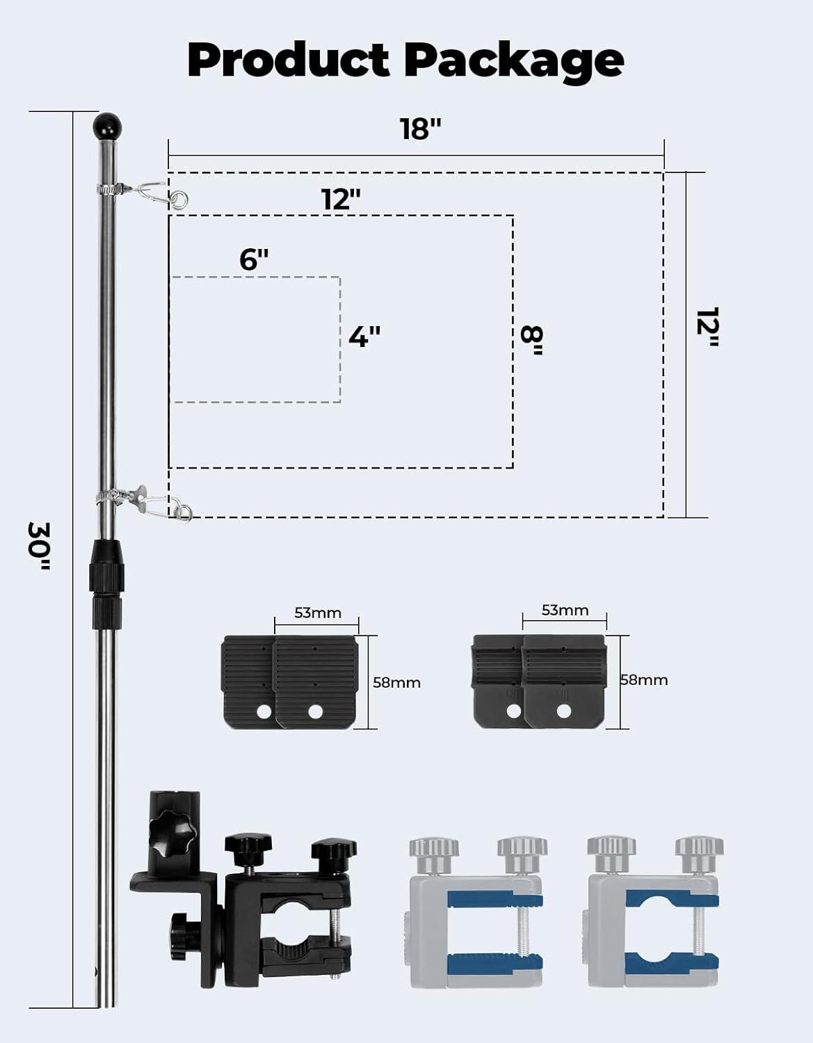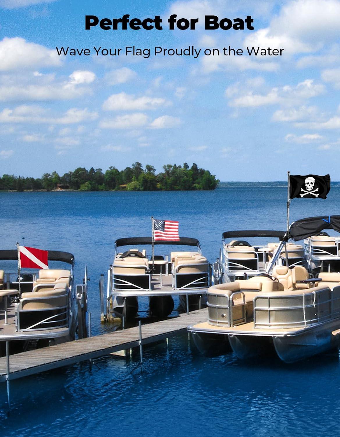 FIT 12''x18''/8‘’x12''/4''x6'' FLAG: Easily install in under 3 min. Attach the pontoon boat flag with steel cable loops, and clamp the pontoon boat flag pole on the rail. Say goodbye to complicated setups