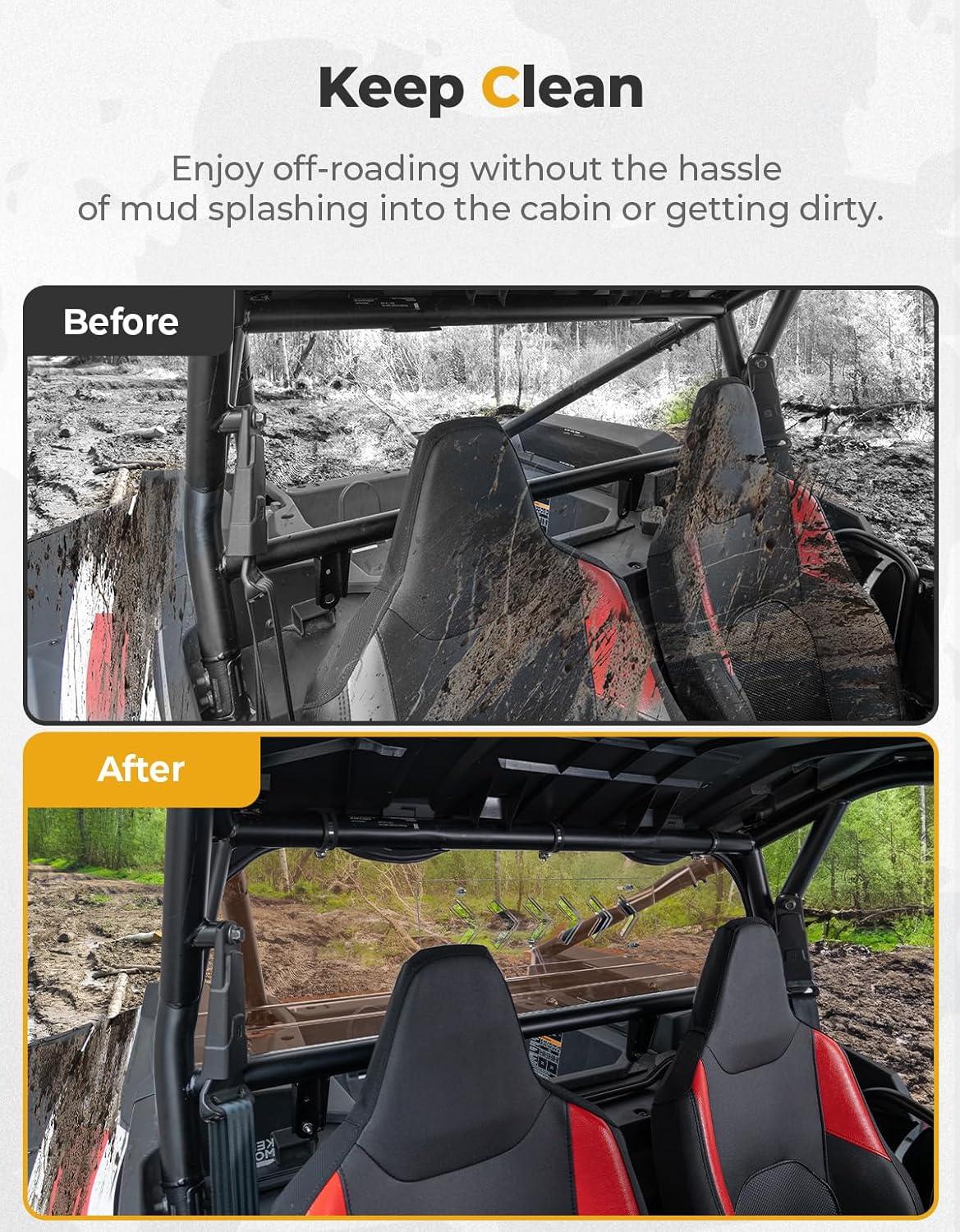 Waterproof & Noise Reduction: Equipped with a thick rubber pad, this rear windshield ensures a snug, waterproof, and mud-resistant seal. It significantly reduces noise for a more comfortable ride while providing superior protection against the elements