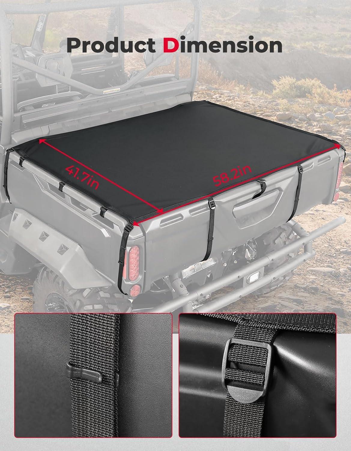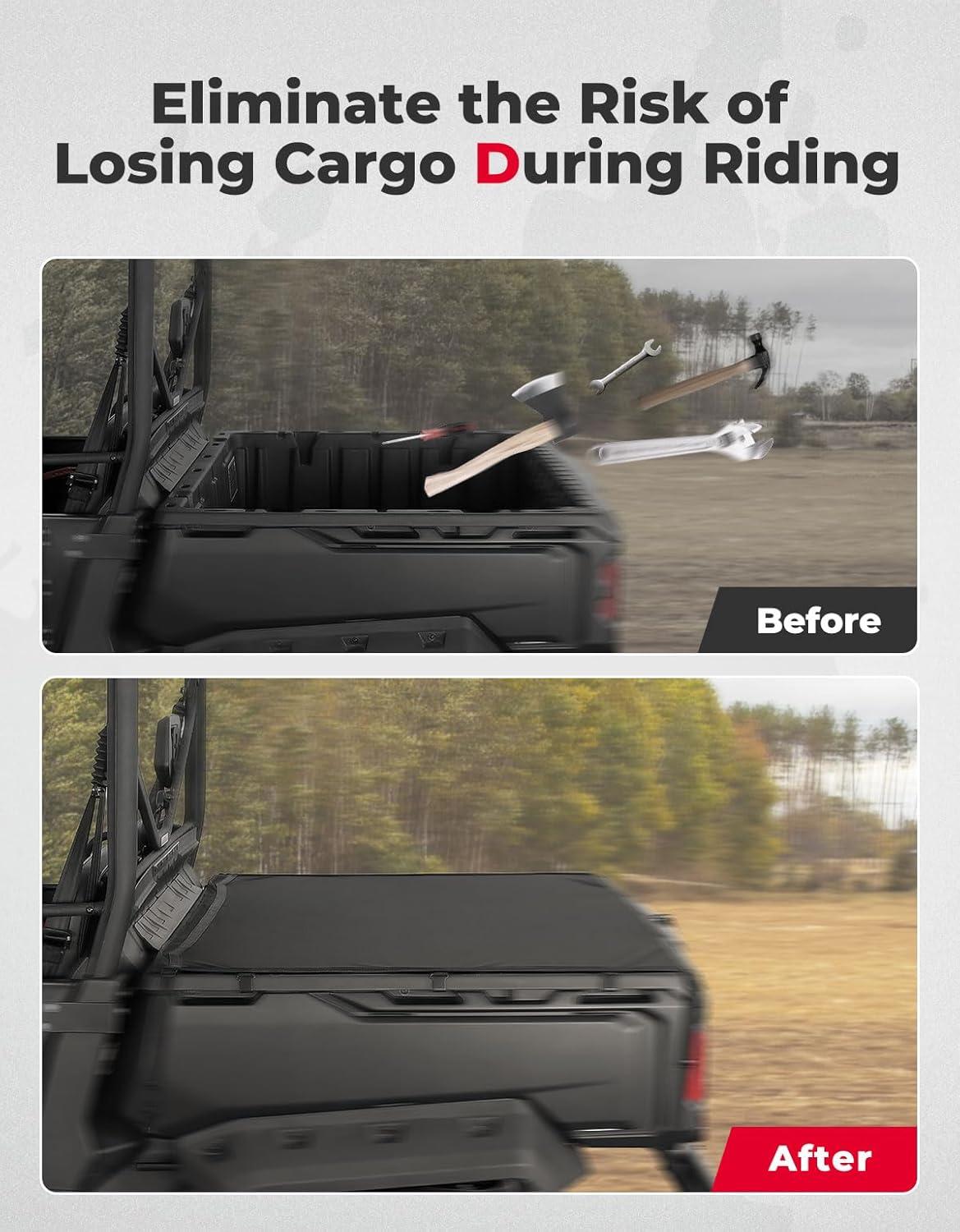 Durable Materials: UTV cargo bed box cover is made of durable materials with ultra-high strength netting and integrated ripstop meshing, what's more, cargo nets are webbing stitched in a grid, typically with several anchor points for securely fixing your valuable items