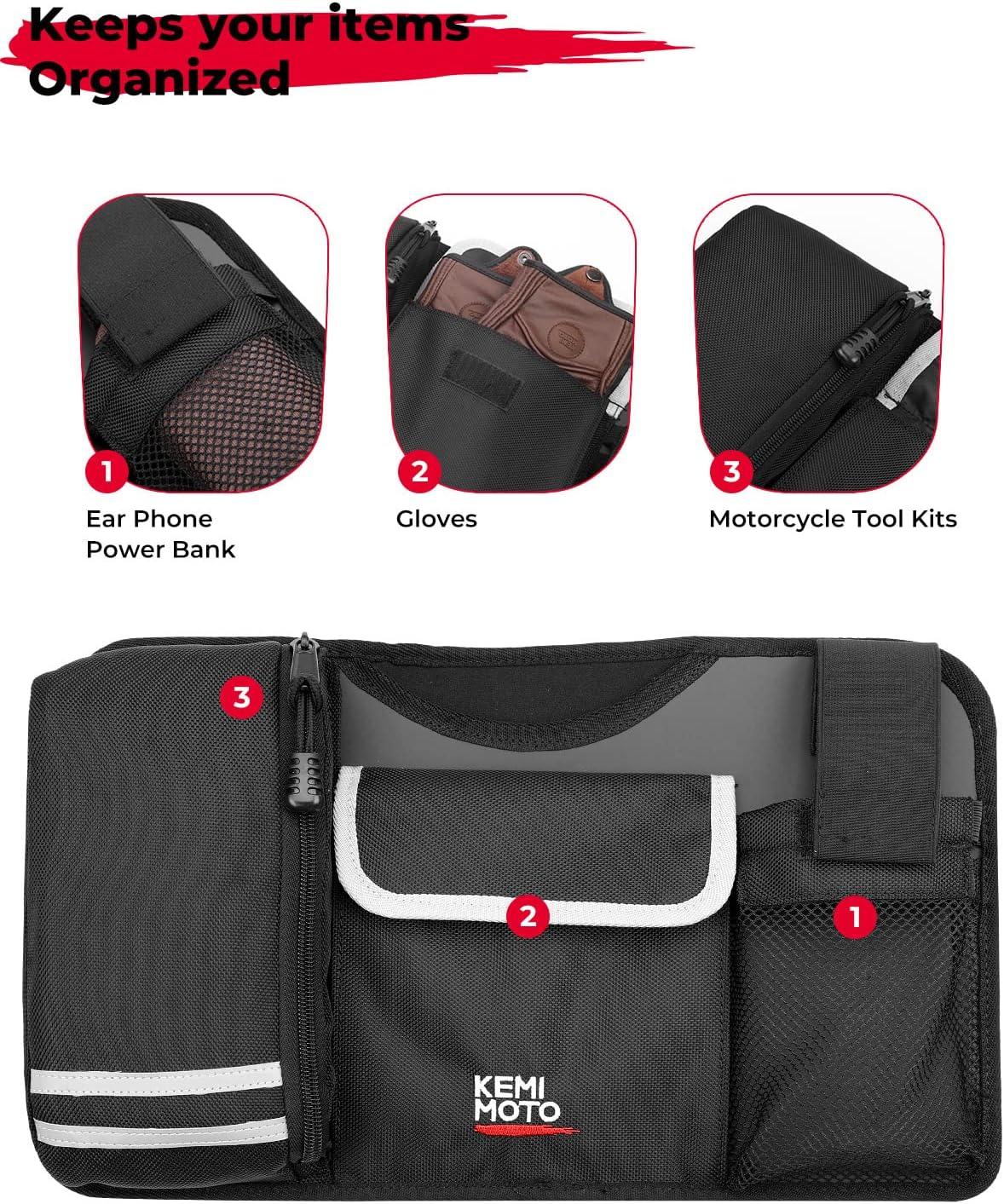 Multi-pockets for Storage: Lots of different pockets for putting different kinds of items. such as cell phones, keys, wallets, gloves, lock, goggles, registration and insurance documents