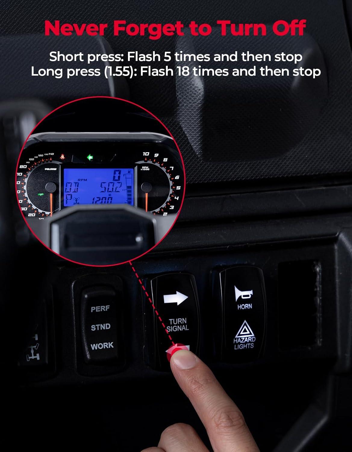 Auto-Cancel Rocker Switch​: The amber turn signal kit with rocker switch: short press (flashes 5 times then auto-off); long press (1.5s, flashes 18 times then auto-off). high-penetration amber light ensures quick detection by trailing drivers in rain, snow or fog, enhancing road safety