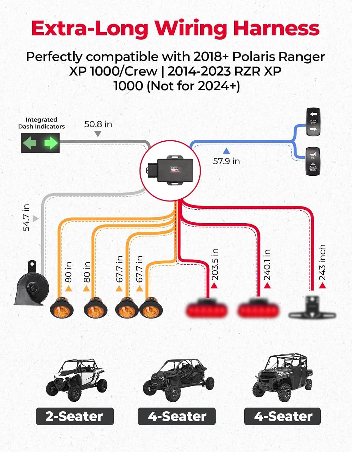 Fitment: KEMIMOTO street-legal turn signal kit is compatible with Polaris RZR XP 1000 2/4-Seater 2018 2019 2020 2021 2022 2023 (Not for 2024+ Vehicle) | compatible with Ranger XP 1000/CREW XP 10000 2018 2019 2020 2021 2022 2023 2024 2025. Our turn signal kit lets you effortlessly get your ride street-legal and step up safety on the road