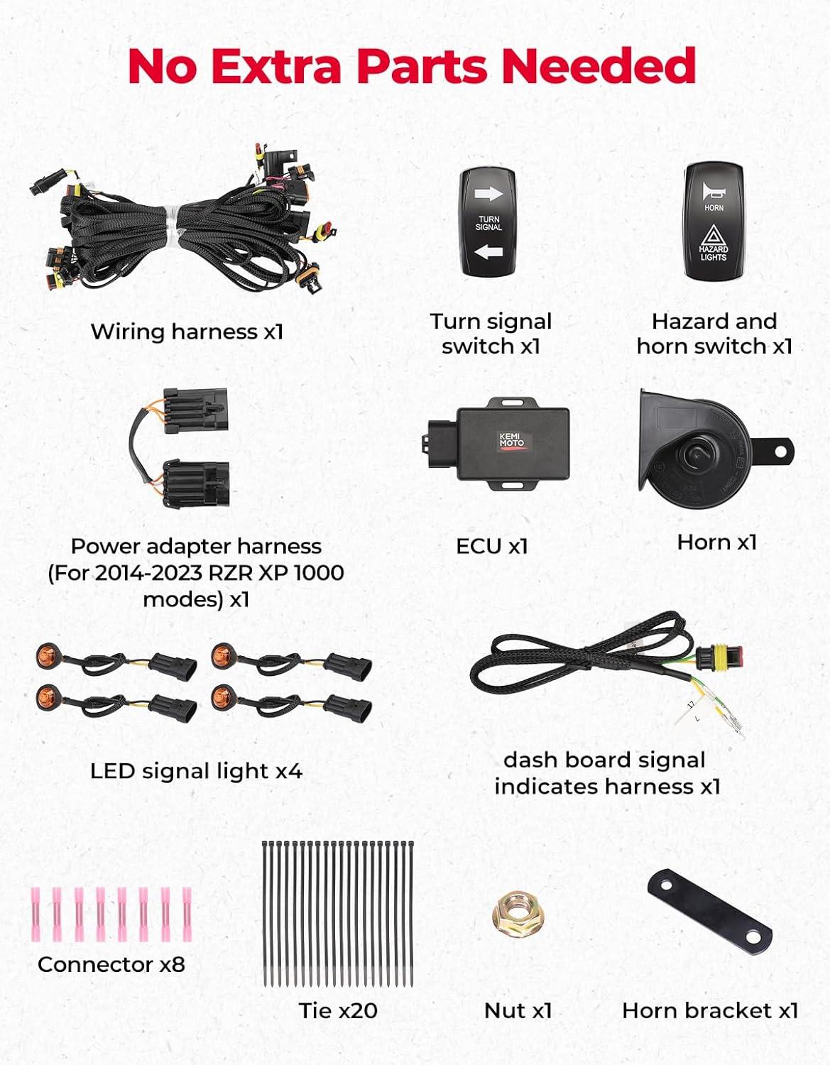 What You Get:The street legal blinker kit included wiring harness x1, turn signal switch x1, hazard and horn switch x1, Power adapter harness (For 2014-2023 RZR XP 1000 modes) x1, ecu x1, horn x1, led signal light x4, dash board signal indicates harness x1, connector x8, tie x20, nut x1, horn bracket x1