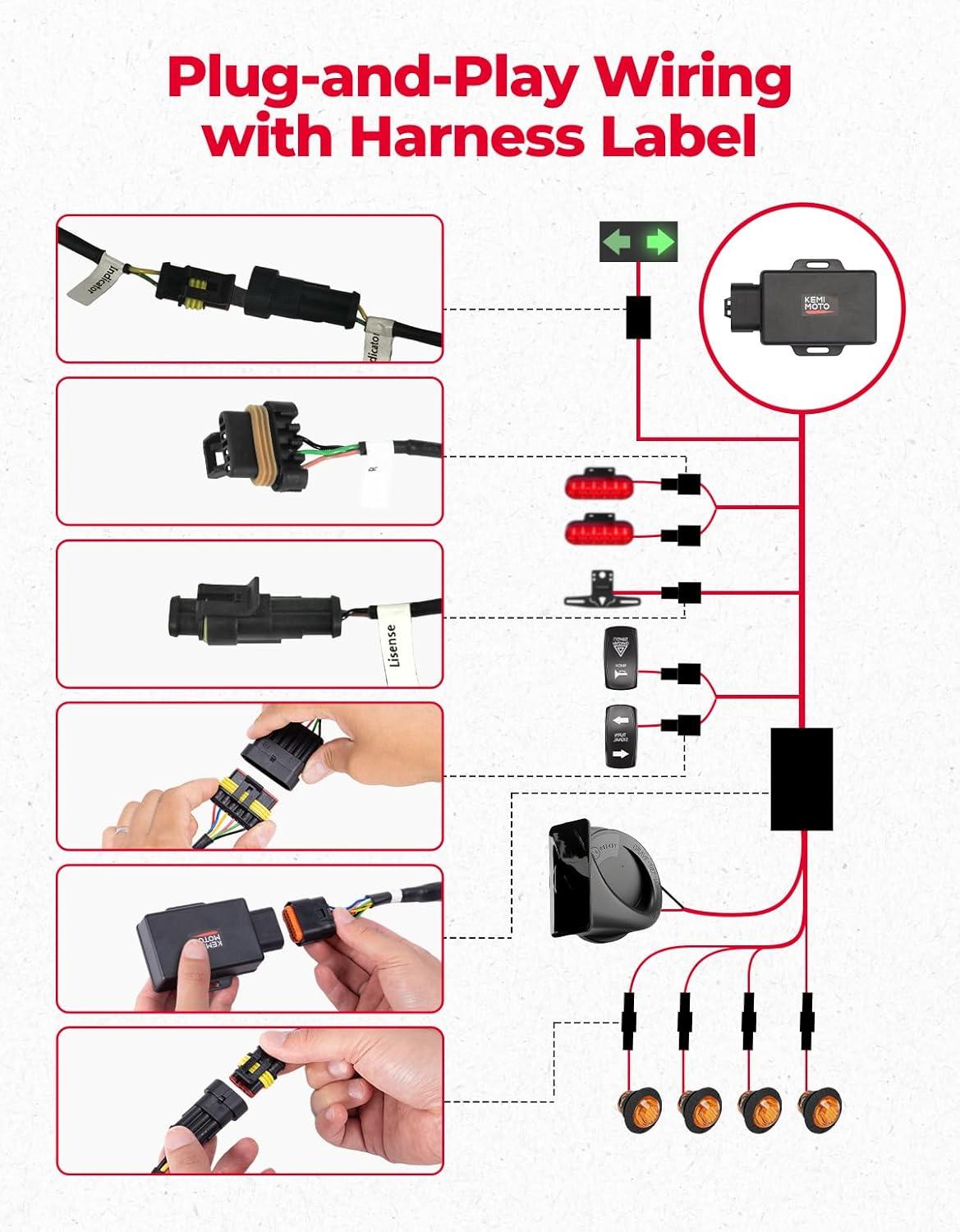 110DB Horn & Rear Tail Light plug: As a driver, this UTV blinker kit has a 110dB horn to alert nearby UTV and people when needed—loud enough to be heard, but not so sudden or harsh that it startles them. ​​KEMIMOTO turn signal kit works with factory DRL—no cutting or connecting wires needed—unlike plug-cutting kits