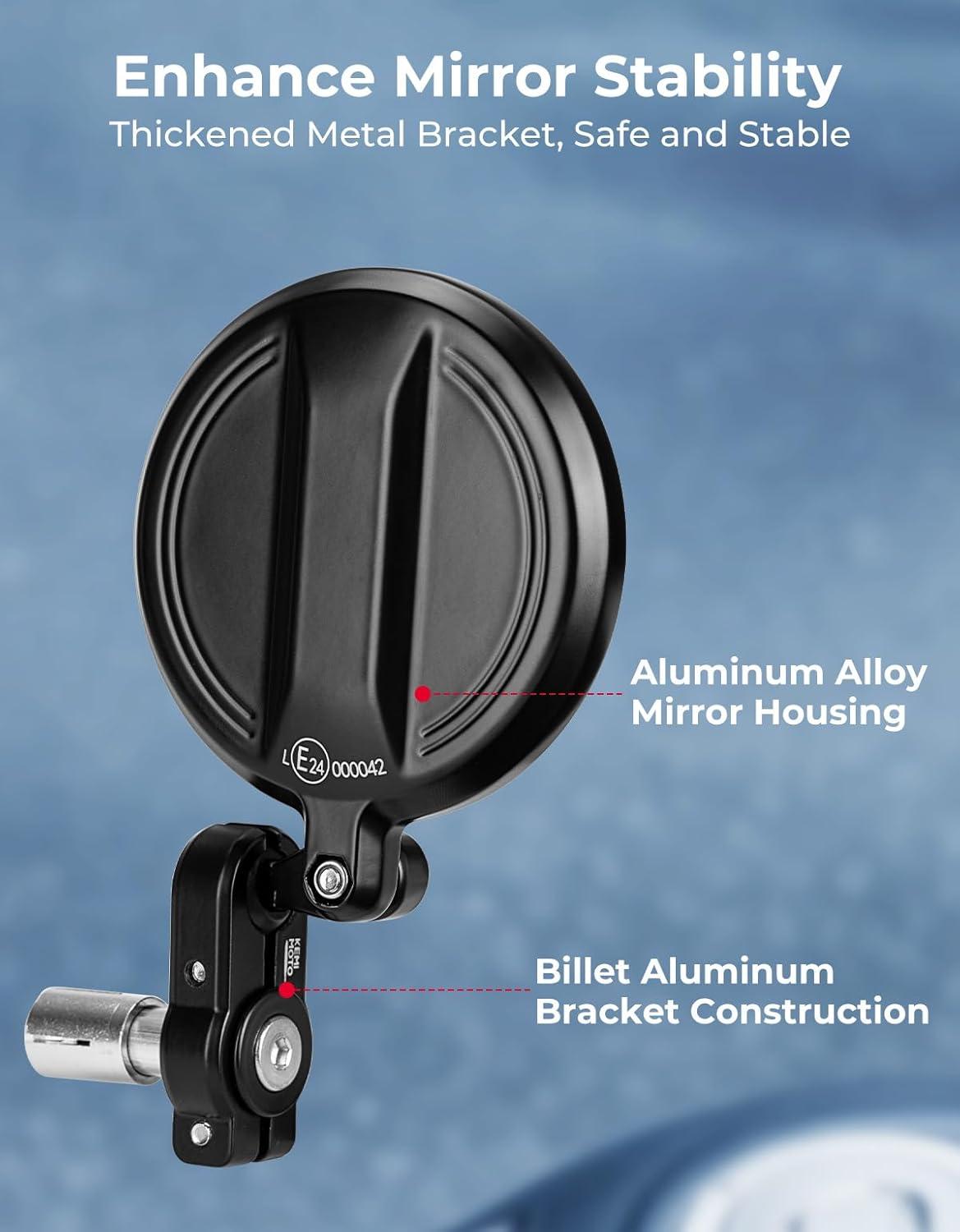 Metal Material: Crafted from full billet aluminum material, our handlebar mirrors are built to last. They can withstand shocks, heat, and aging, and are designed to adapt to any weather condition. This ensures that our motorcycle mirrors are a reliable and long-lasting addition