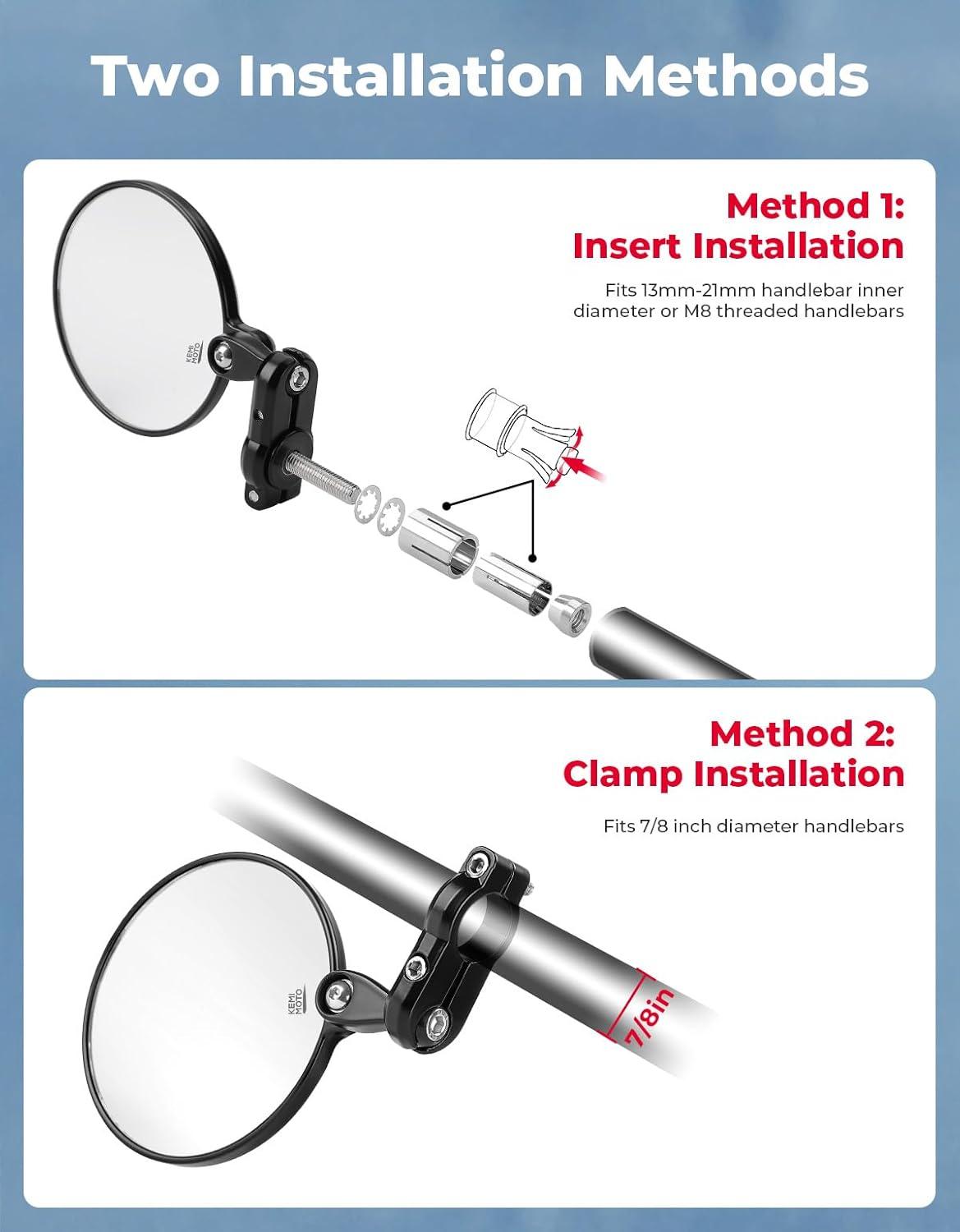 Flexible and Easy Installation: Our mirrors can be installed in two ways. Insert-style fits handlebars with a 13-21mm (0.51-0.83 inch) inner diameter or an 8mm end hole. Clamp-style suits 7/8 inch handlebars. Use a longer wrench and tighten firmly to prevent loosening