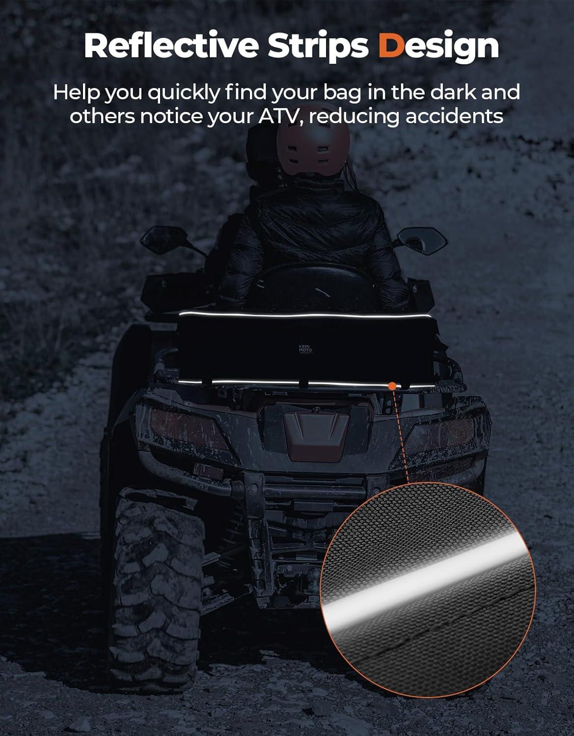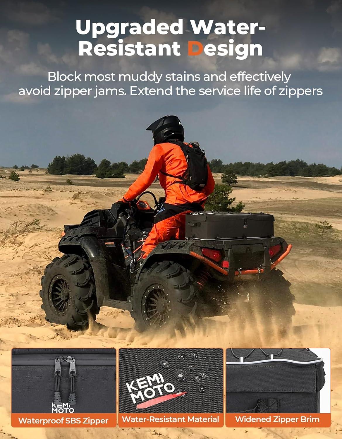 Waterproof SBS Zipper: KEMIMOTO 4-wheeler cargo storage bag is made of 900D Oxford, water-resistant and wear-resistant, so you won't need to worry about branches and rocks scratching your bag; waterproof SBS zipper with a widened brim, which can block most muddy stains. No need to worry about dust, mud, dirt, or debris on the zippers preventing them from opening and closing. Please avoid prolonged exposure to heavy rain or vehicle wash conditions