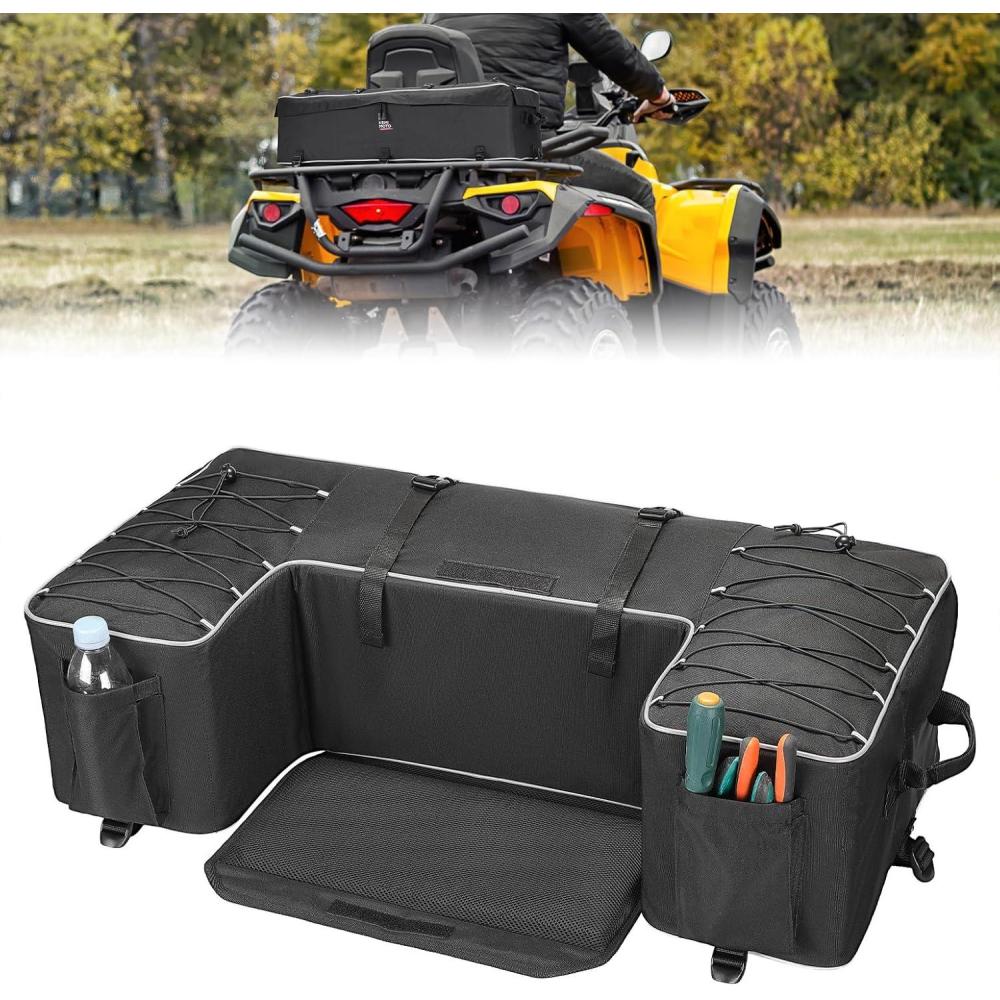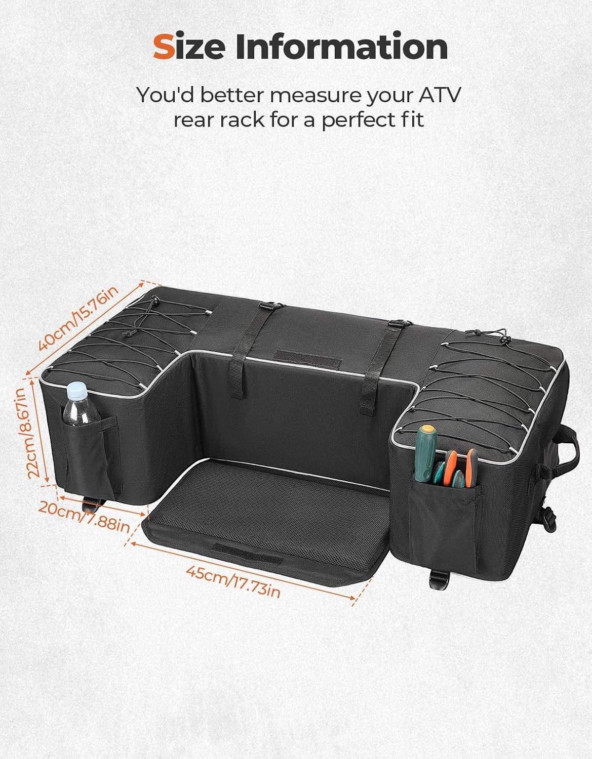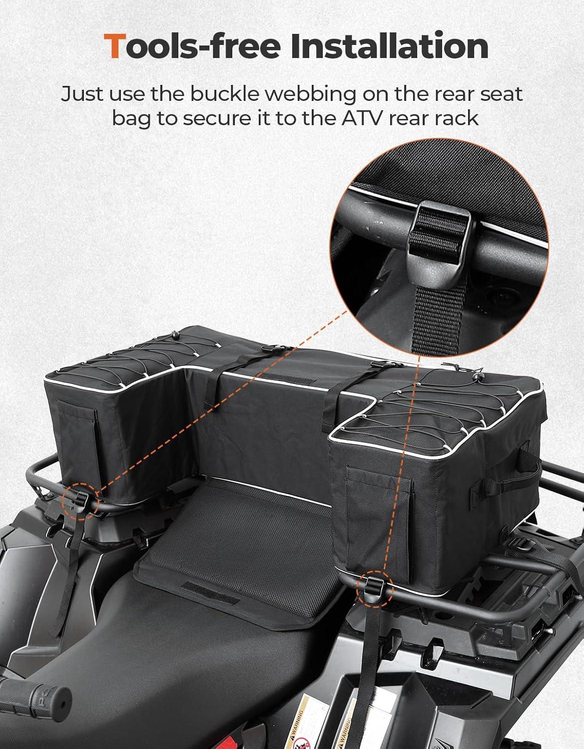 Tools-free Installation: Installation is a breeze. No additional tools or drilling required, just use the buckle webbing on the rear seat bag to secure it to the ATV rear rack. Universal ATV cargo storage bags fit most ATVs, such as compatible with Polaris Sportsman 450 500 570 Scrambler Can-Am Outlander 570 Kawasaki Brute Force Arctic Cat TRX 450 700 FourTrax Rancher Suzuki 500 Grizzly 550 ATV rear seat bag padded bottom