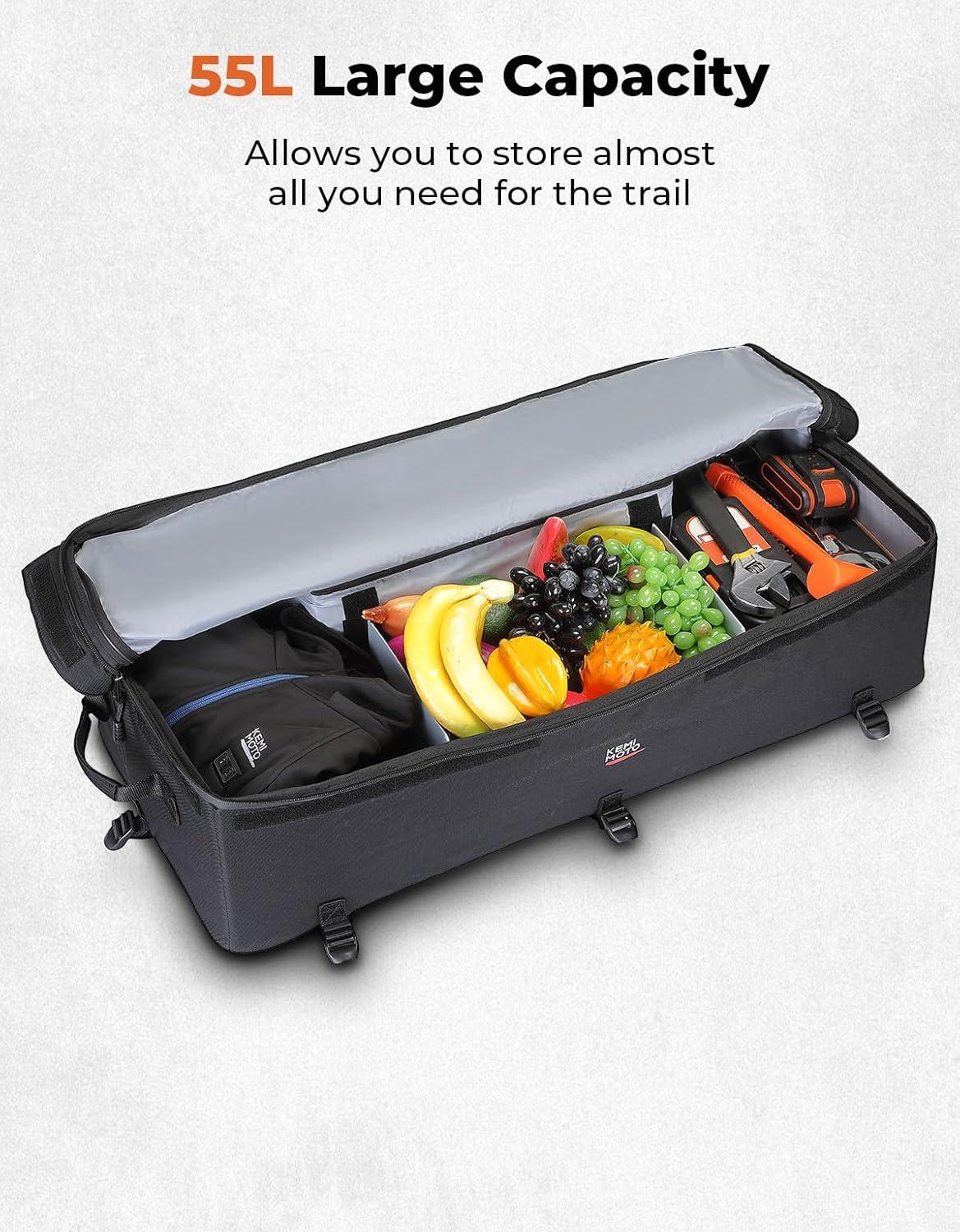 55L Large Capacity: The capacity is about 55L, and can hold whatever you need for the trail. KEMIMOTO ATV storage bag is very good for maintenance tools, first aid supplies, clothing, fruits, food, cold drinks, and other items; The crisscrossed elastic ropes and quick-release buckle webbing on the top can be used to fix sleeping bags, tents, shovels, hunting tools, etc. It is recommended to use the top fixing system when fully loaded; Otherwise, it will collapse