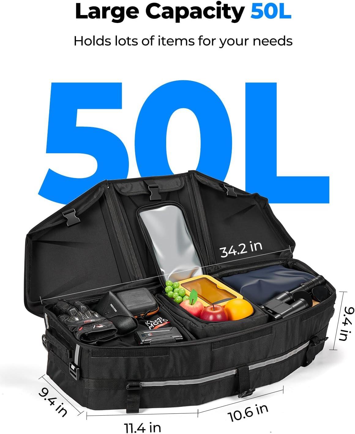 Large 50L Storage Capacity: KEMIMOTO ATV Insulated Cargo bag with a storage capacity of about 50L, perfect for storing clothes, gloves, sleeping bags, cables, toolboxes, and other essentials