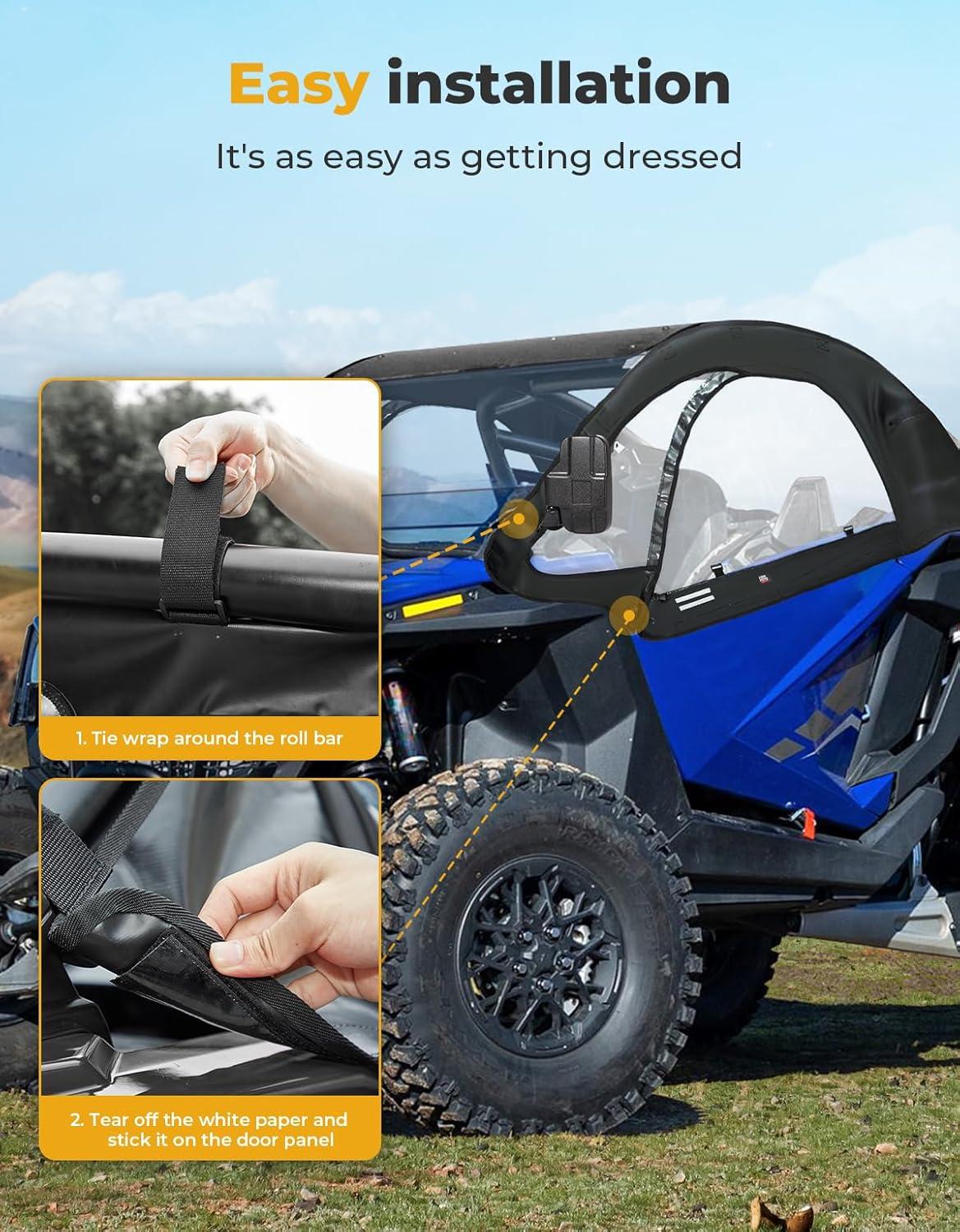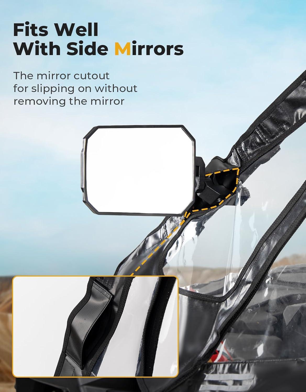 Advanced Fit Design: KEMIMOTO upper doors introduce a design featuring removable straps and mirror holes that are compatible with roofs, windshields, and mirrors. Note: Carefully peel the self-adhesive tape to avoid damaging decals due to its strong adhesion
