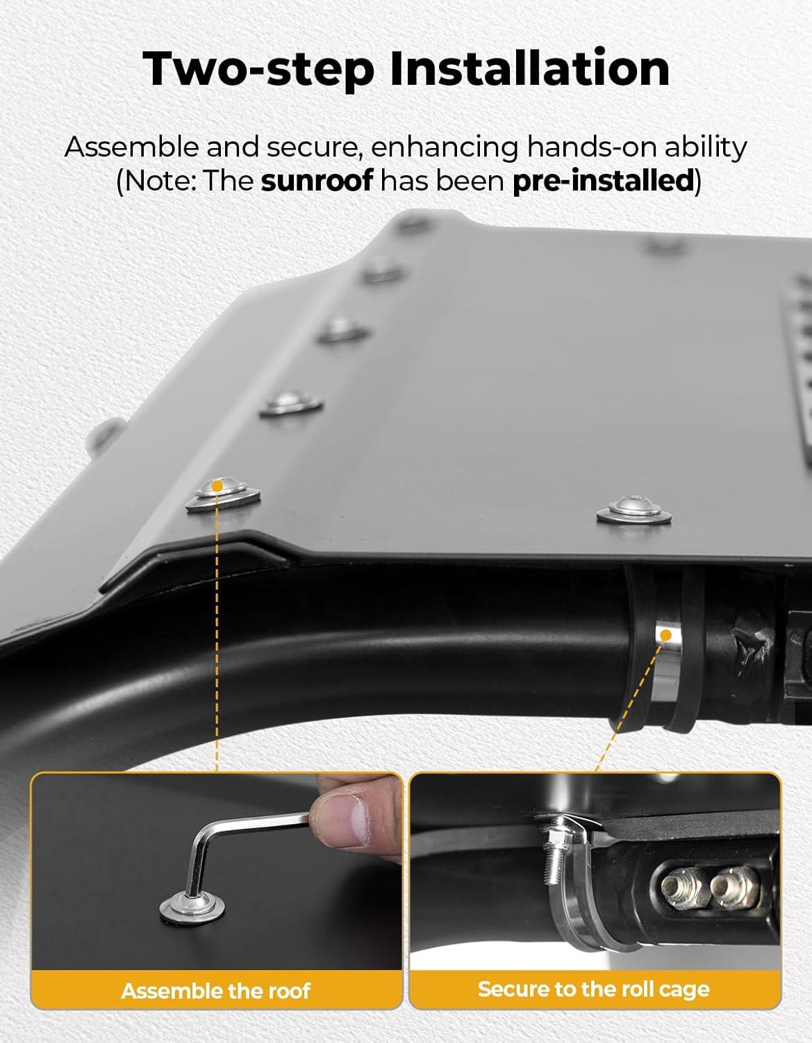 Easy Installation: The sunroof is pre-installed; simply assemble the three roof panels, attach the rubber pads, and secure the roof to the roll bar using clamps. Enhance your DIY skills by starting with this roof installation